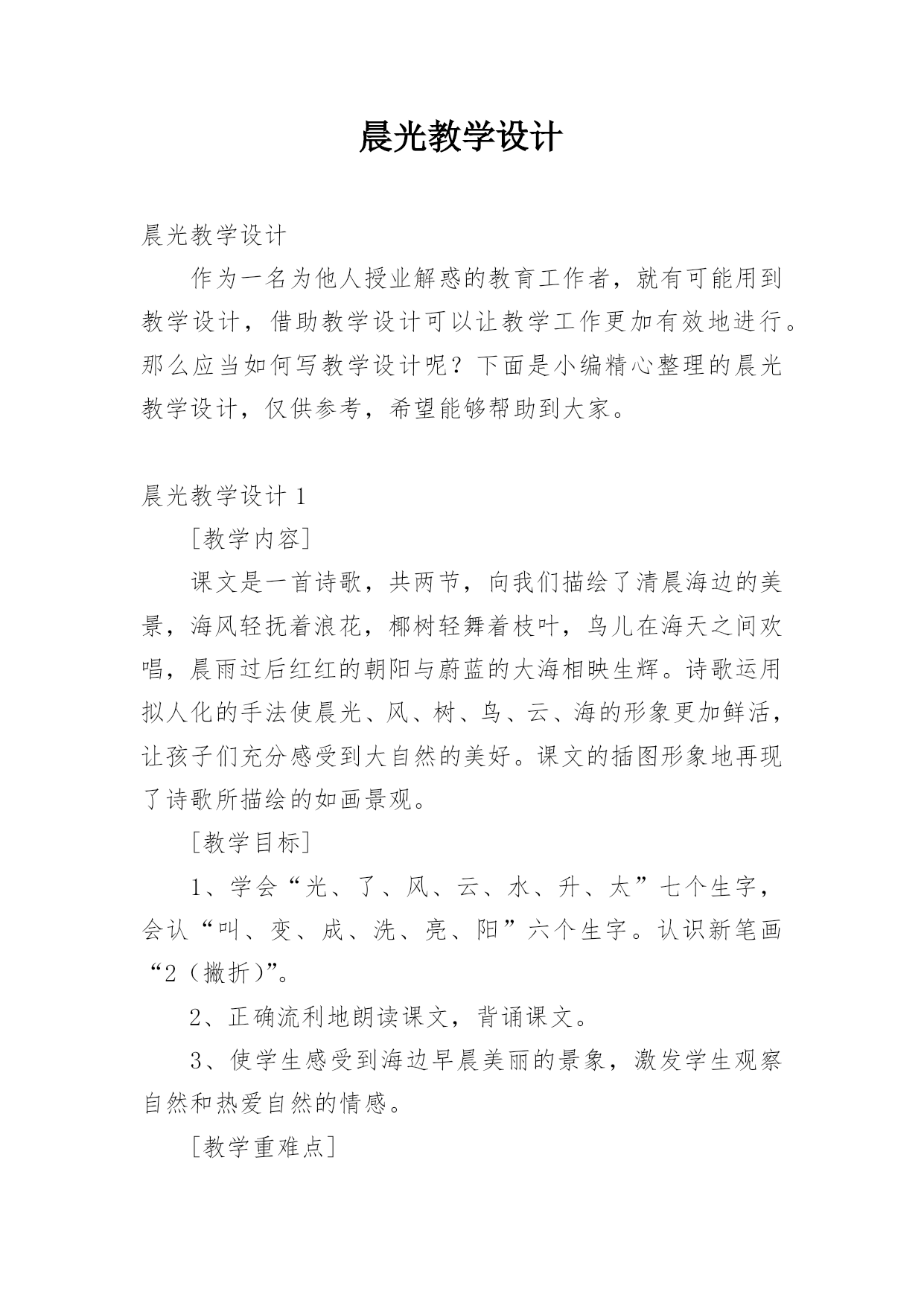 晨光教学设计晨光教学设计作为一名为他人授业解惑的教育工作者,就有可能用到教学设计,借助教学设计可以让教学工作更加有效地进行。那么应当如何写教学设计呢?下面是小编精心整理的晨光教学设计,仅供参考,希望能够帮助到大家。晨光教学设计1[教学内容]课文是一首诗歌,共两节,向我们描绘了清晨海边的美景,海风轻抚着浪花,椰树轻舞着枝叶,鸟儿在海天之间欢唱,晨雨过后红红的朝阳与蔚蓝的大海相映生辉。诗歌运用拟人化的手法使晨光、风、树、鸟、云、海的形象更加鲜活,让孩子们充分感受到大自然的美好。课文的插图形象地再现了诗歌所描绘