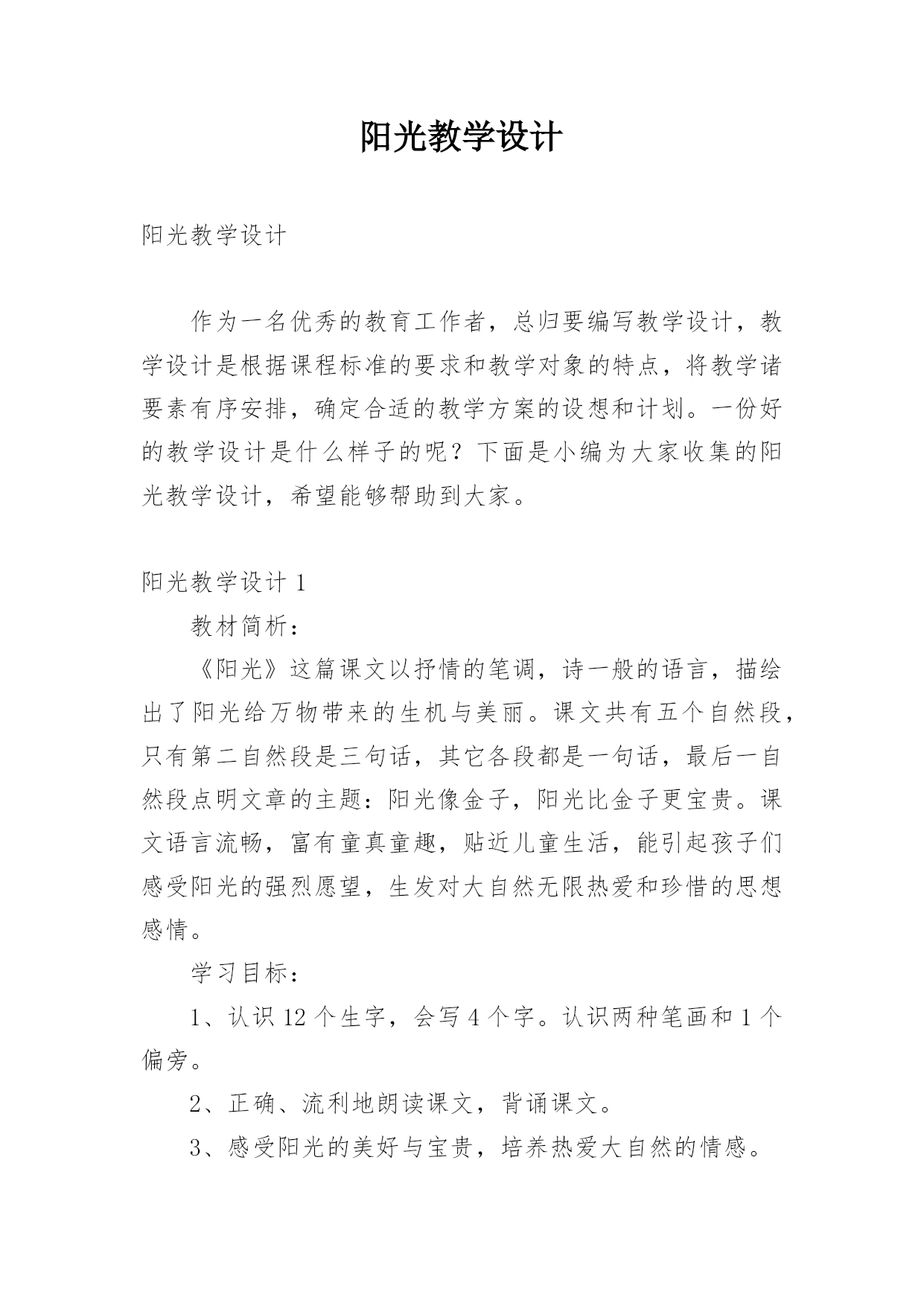 阳光教学设计阳光教学设计作为一名优秀的教育工作者,总归要编写教学设计,教学设计是根据课程标准的要求和教学对象的特点,将教学诸要素有序安排,确定合适的教学方案的设想和计划。一份好的教学设计是什么样子的呢?下面是小编为大家收集的阳光教学设计,希望能够帮助到大家。阳光教学设计1教材简析:《阳光》这篇课文以抒情的笔调,诗一般的语言,描绘出了阳光给万物带来的生机与美丽。课文共有五个自然段,只有第二自然段是三句话,其它各段都是一句话,最后一自然段点明文章的主题:阳光像金子,阳光比金子更宝贵。课文语言流畅,富有童真童趣