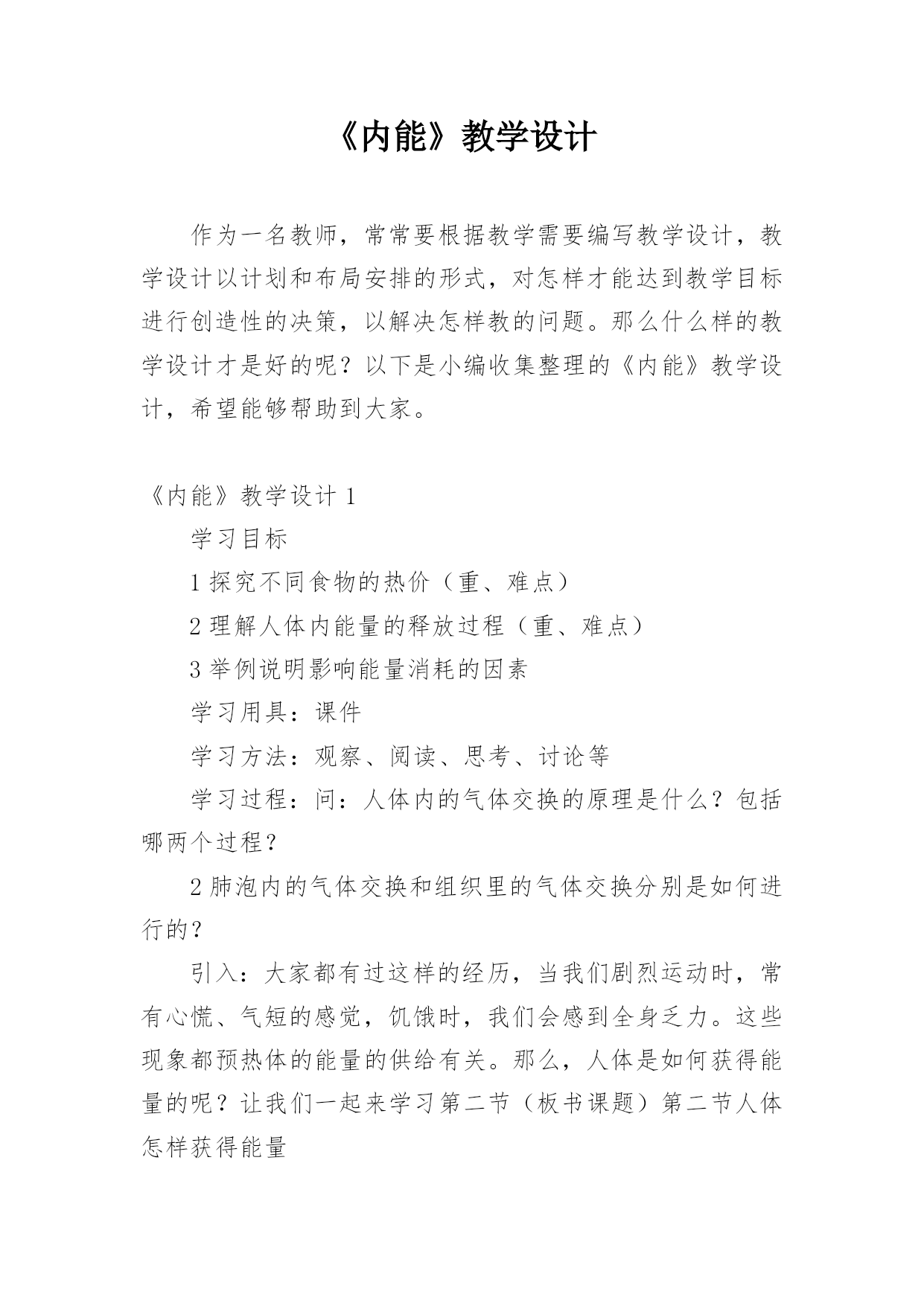 《内能》教学设计作为一名教师,常常要根据教学需要编写教学设计,教学设计以计划和布局安排的形式,对怎样才能达到教学目标进行创造性的决策,以解决怎样教的问题。那么什么样的教学设计才是好的呢?以下是小编收集整理的《内能》教学设计,希望能够帮助到大家。《内能》教学设计1学习目标1探究不同食物的热价(重、难点)2理解人体内能量的释放过程(重、难点)3举例说明影响能量消耗的因素学习用具:课件学习方法:观察、阅读、思考、讨论等学习过程:问:人体内的气体交换的原理是什么?包括哪两个过程?2肺泡内的气体交换和组织里的气体交