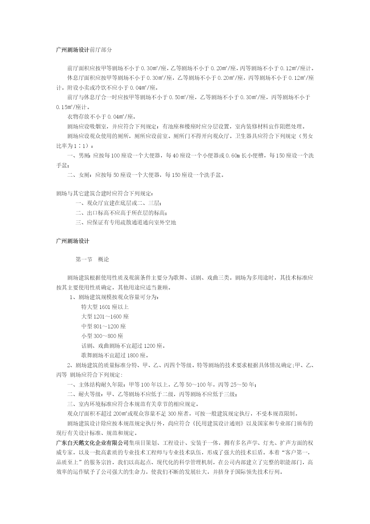 HYPERLINK"http://com.izhisou.com/companyIndex_c-gzbte.htm"广州剧场设计前厅部分前厅面积应按甲等剧场不小于0.30㎡/座,乙等剧场不小于0.20㎡/座,丙等剧场不小于0.12㎡/座计。休息厅面积应按甲等剧场不小于0.30㎡/座,乙等剧场不小于0.20㎡/座,丙等剧场不小于0.12㎡/座计。附设小卖或冷饮不应小于0.04㎡/座。前厅与休息厅合一时应按甲等剧场不小于0.50㎡/座,乙等剧场不小于0.30㎡/座,丙等剧场不小于0.15㎡/座计。衣物存