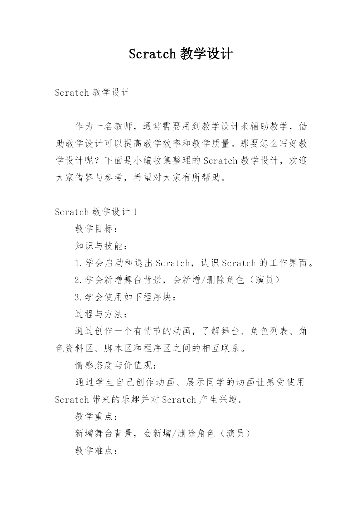 Scratch教学设计Scratch教学设计作为一名教师,通常需要用到教学设计来辅助教学,借助教学设计可以提高教学效率和教学质量。那要怎么写好教学设计呢?下面是小编收集整理的Scratch教学设计,欢迎大家借鉴与参考,希望对大家有所帮助。Scratch教学设计1教学目标:知识与技能:1.学会启动和退出Scratch,认识Scratch的工作界面。2.学会新增舞台背景,会新增/删除角色(演员)3.学会使用如下程序块:过程与方法:通过创作一个有情节的动画,了解舞台、角色列表、角色资料区、脚本区和程序区之间的相