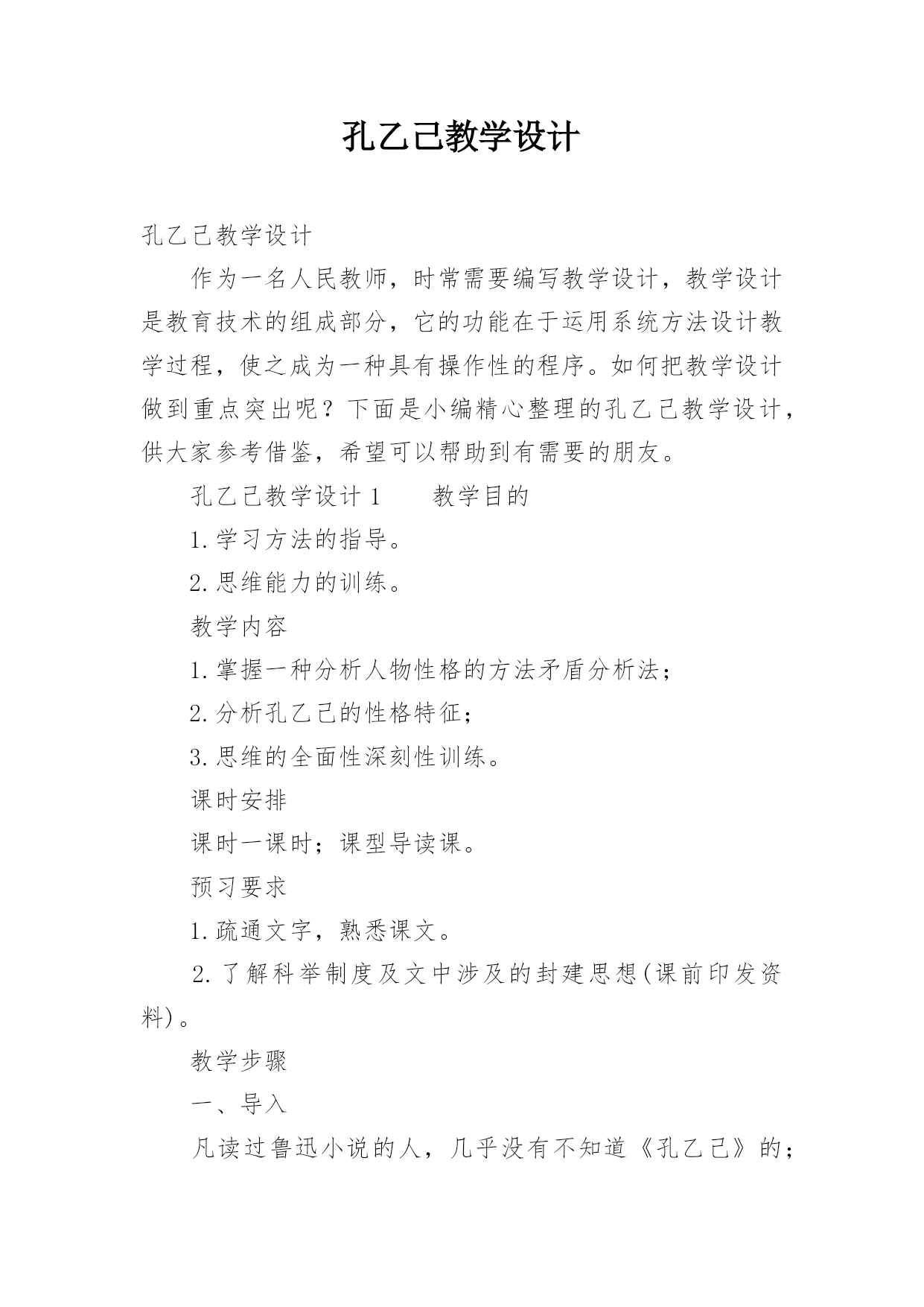 孔乙己教学设计孔乙己教学设计作为一名人民教师,时常需要编写教学设计,教学设计是教育技术的组成部分,它的功能在于运用系统方法设计教学过程,使之成为一种具有操作性的程序。如何把教学设计做到重点突出呢?下面是小编精心整理的孔乙己教学设计,供大家参考借鉴,希望可以帮助到有需要的朋友。孔乙己教学设计1教学目的1.学习方法的指导。2.思维能力的训练。教学内容1.掌握一种分析人物性格的方法矛盾分析法;2.分析孔乙己的性格特征;3.思维的全面性深刻性训练。课时安排课时一课时;课型导读课。预习要求1.疏通文字,熟悉课文。2