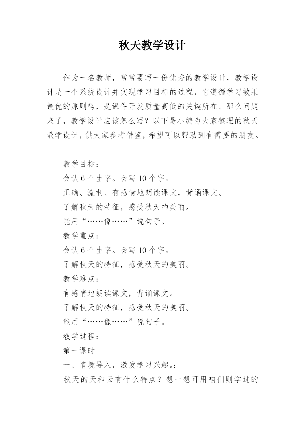 秋天教学设计作为一名教师,常常要写一份优秀的教学设计,教学设计是一个系统设计并实现学习目标的过程,它遵循学习效果最优的原则吗,是课件开发质量高低的关键所在。那么问题来了,教学设计应该怎么写?以下是小编为大家整理的秋天教学设计,供大家参考借鉴,希望可以帮助到有需要的朋友。教学目标:会认6个生字。会写10个字。正确、流利、有感情地朗读课文,背诵课文。了解秋天的特征,感受秋天的美丽。能用“……像……”说句子。教学重点:会认6个生字。会写10个字。了解秋天的特征,感受秋天的美丽。教学难点:有感情地朗读课文,背诵课