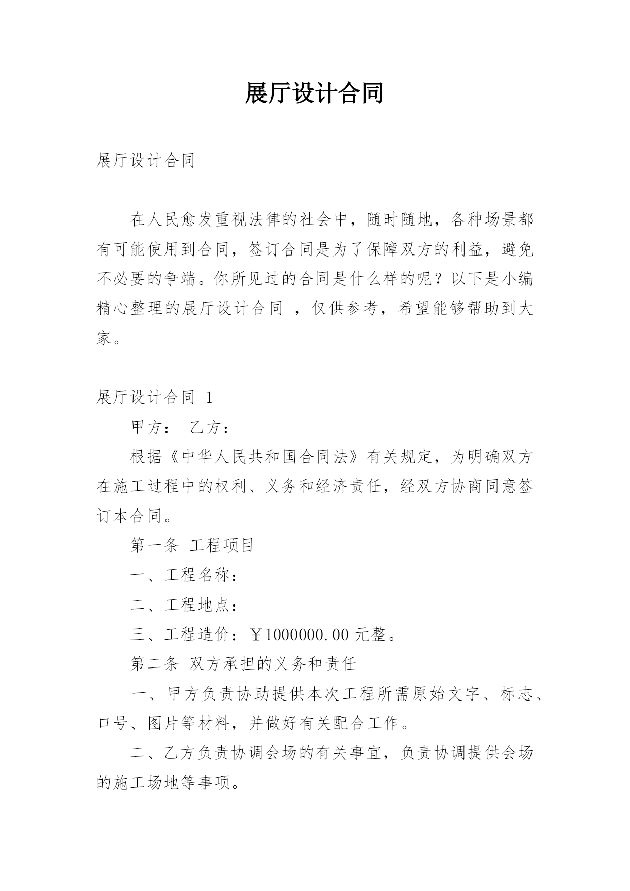 展厅设计合同展厅设计合同在人民愈发重视法律的社会中,随时随地,各种场景都有可能使用到合同,签订合同是为了保障双方的利益,避免不必要的争端。你所见过的合同是什么样的呢?以下是小编精心整理的展厅设计合同,仅供参考,希望能够帮助到大家。展厅设计合同1甲方:乙方:根据《中华人民共和国合同法》有关规定,为明确双方在施工过程中的权利、义务和经济责任,经双方协商同意签订本合同。第一条工程项目一、工程名称:二、工程地点:三、工程造价:¥1000000.00元整。第二条双方承担的义务和责任一、甲方负责协助提供本次工程所需原