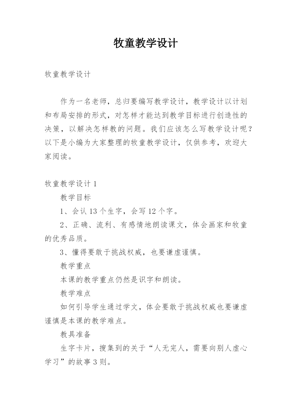 牧童教学设计牧童教学设计作为一名老师,总归要编写教学设计,教学设计以计划和布局安排的形式,对怎样才能达到教学目标进行创造性的决策,以解决怎样教的问题。我们应该怎么写教学设计呢?以下是小编为大家整理的牧童教学设计,仅供参考,欢迎大家阅读。牧童教学设计1教学目标1、会认13个生字,会写12个字。2、正确、流利、有感情地朗读课文,体会画家和牧童的优秀品质。3、懂得要敢于挑战权威,也要谦虚谨慎。教学重点本课的教学重点仍然是识字和朗读。教学难点如何引导学生通过学文,体会要敢于挑战权威也要谦虚谨慎是本课的教学难点。教