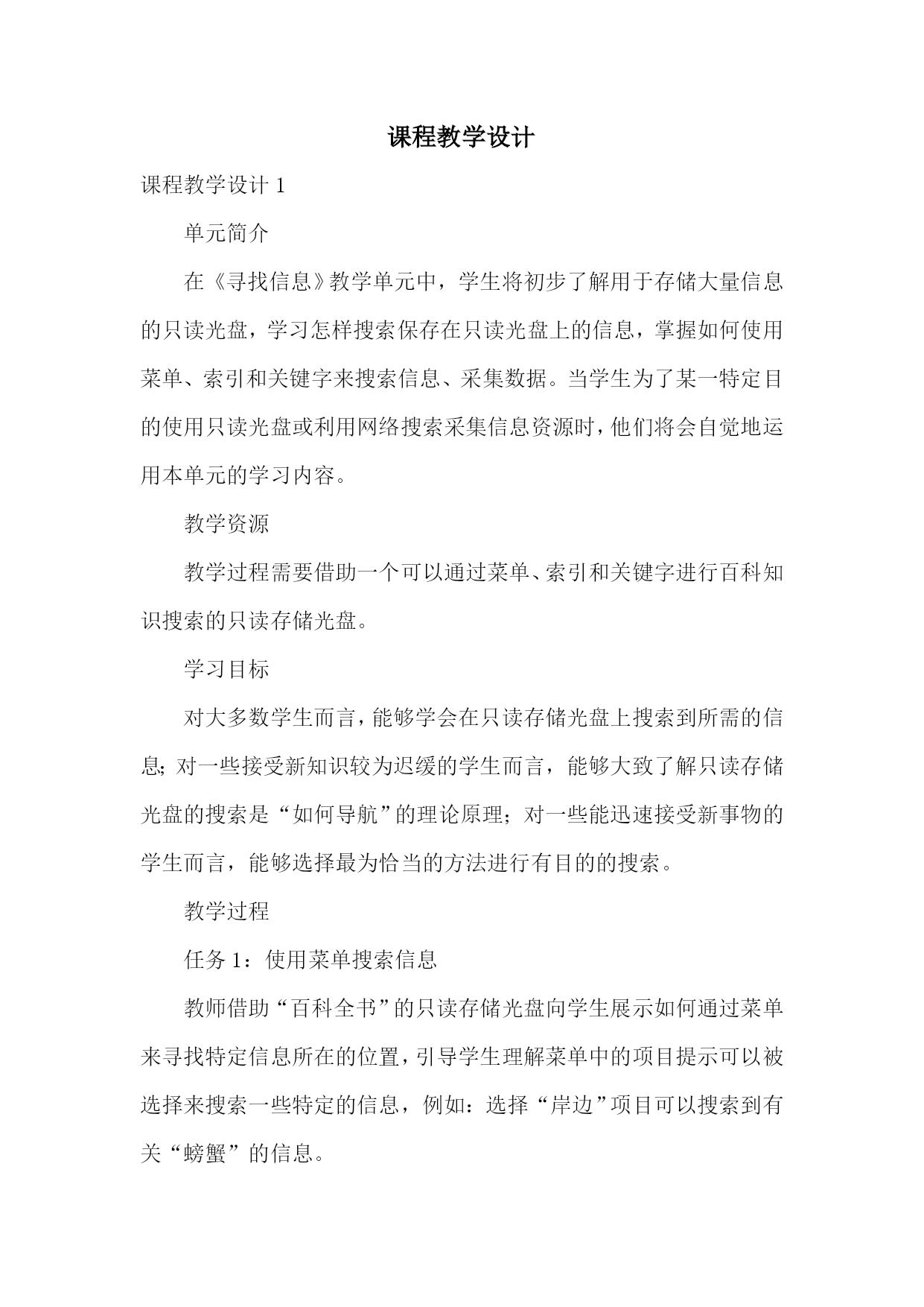 课程教学设计课程教学设计1单元简介在《寻找信息》教学单元中,学生将初步了解用于存储大量信息的只读光盘,学习怎样搜索保存在只读光盘上的信息,掌握如何使用菜单、索引和关键字来搜索信息、采集数据。当学生为了某一特定目的使用只读光盘或利用网络搜索采集信息资源时,他们将会自觉地运用本单元的学习内容。教学资源教学过程需要借助一个可以通过菜单、索引和关键字进行百科知识搜索的只读存储光盘。学习目标对大多数学生而言,能够学会在只读存储光盘上搜索到所需的信息;对一些接受新知识较为迟缓的学生而言,能够大致了解只读存储光盘的搜索