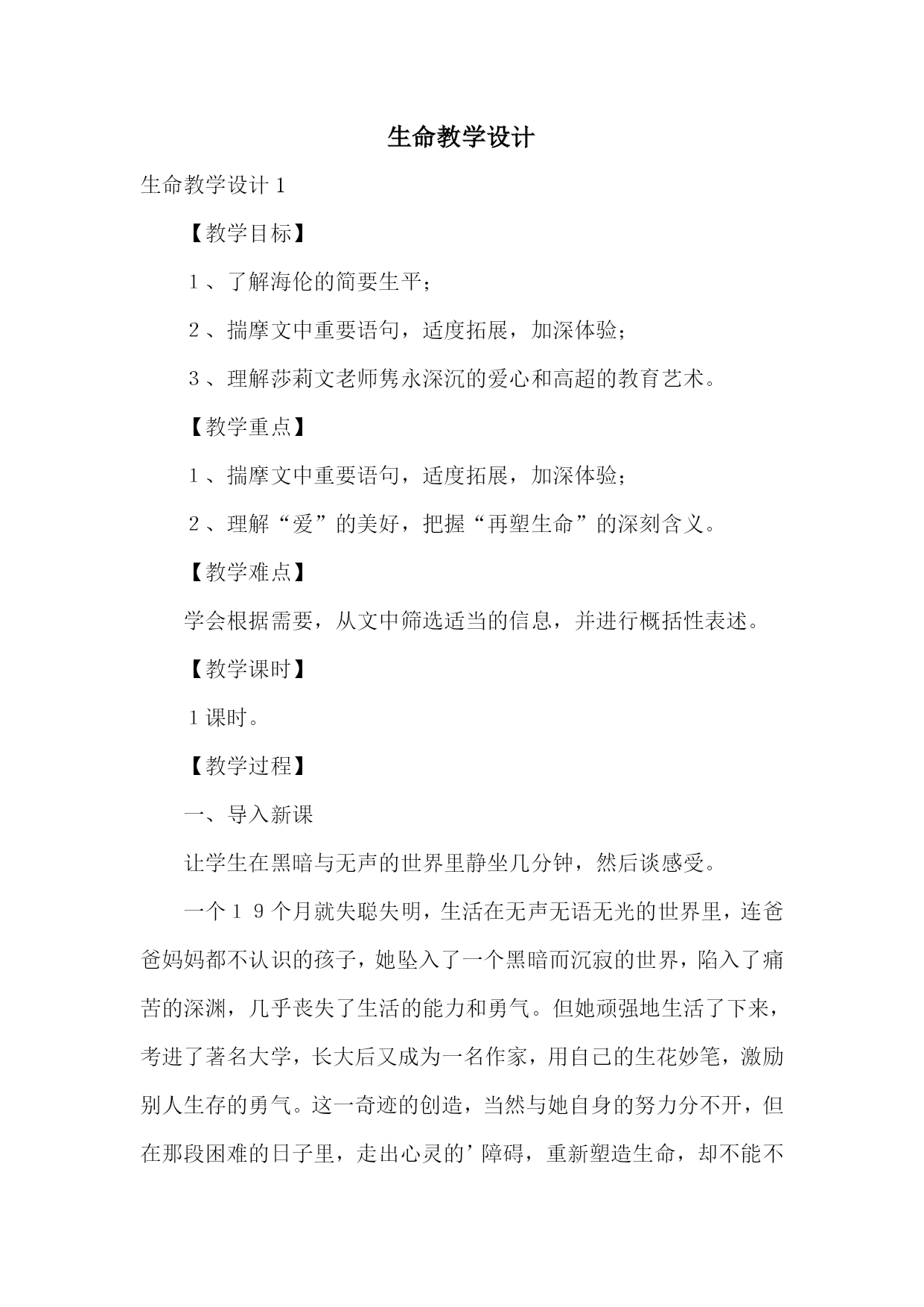 生命教学设计生命教学设计1【教学目标】1、了解海伦的简要生平;2、揣摩文中重要语句,适度拓展,加深体验;3、理解莎莉文老师隽永深沉的爱心和高超的教育艺术。【教学重点】1、揣摩文中重要语句,适度拓展,加深体验;2、理解“爱”的美好,把握“再塑生命”的深刻含义。【教学难点】学会根据需要,从文中筛选适当的信息,并进行概括性表述。【教学课时】1课时。【教学过程】一、导入新课让学生在黑暗与无声的世界里静坐几分钟,然后谈感受。一个19个月就失聪失明,生活在无声无语无光的世界里,连爸爸妈妈都不认识的孩子,她坠入了一个黑