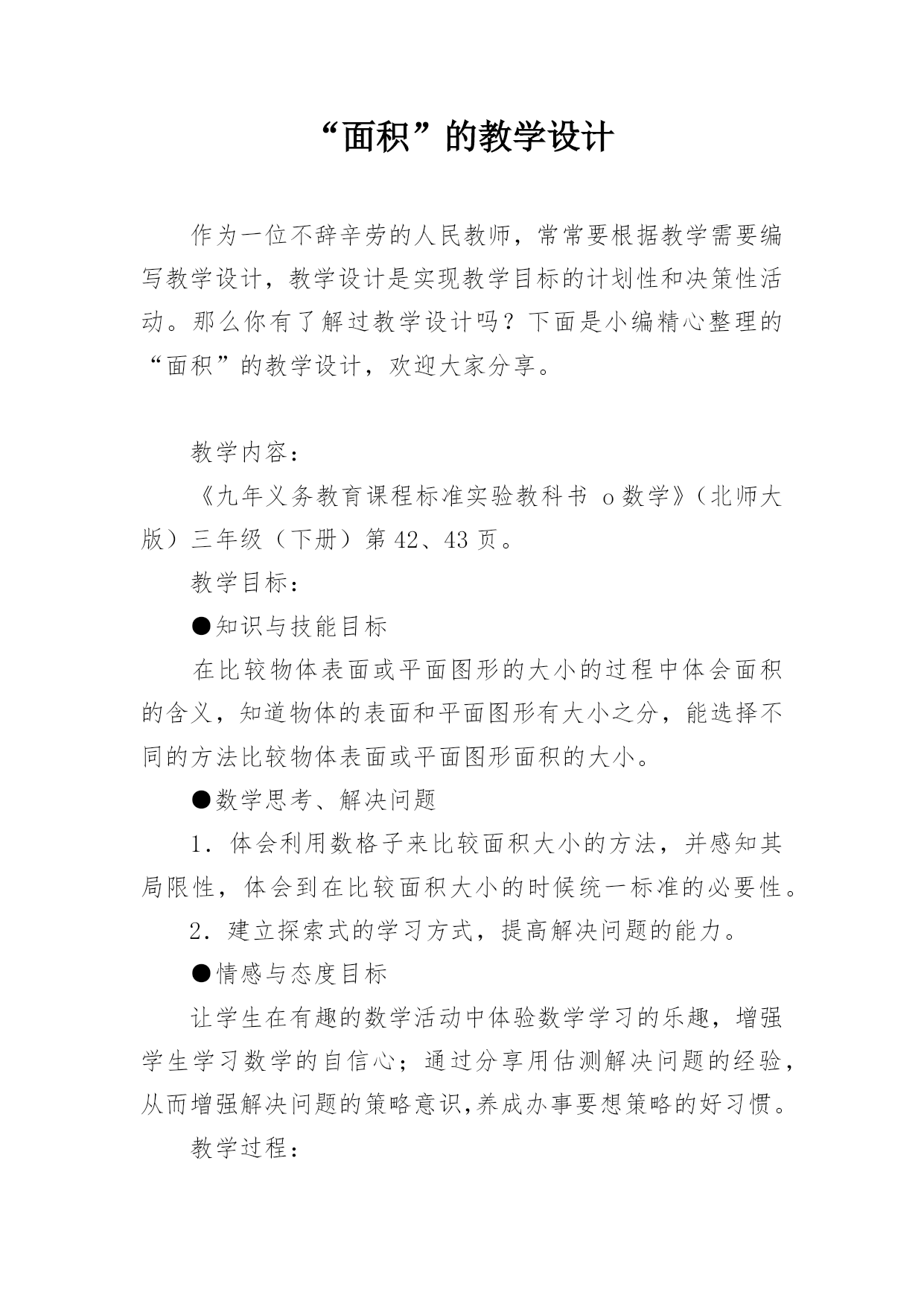 “面积”的教学设计作为一位不辞辛劳的人民教师,常常要根据教学需要编写教学设计,教学设计是实现教学目标的计划性和决策性活动。那么你有了解过教学设计吗?下面是小编精心整理的“面积”的教学设计,欢迎大家分享。教学内容:《九年义务教育课程标准实验教科书o数学》(北师大版)三年级(下册)第42、43页。教学目标:●知识与技能目标在比较物体表面或平面图形的大小的过程中体会面积的含义,知道物体的表面和平面图形有大小之分,能选择不同的方法比较物体表面或平面图形面积的大小。●数学思考、解决问题1.体会利用数格子来比较面积大