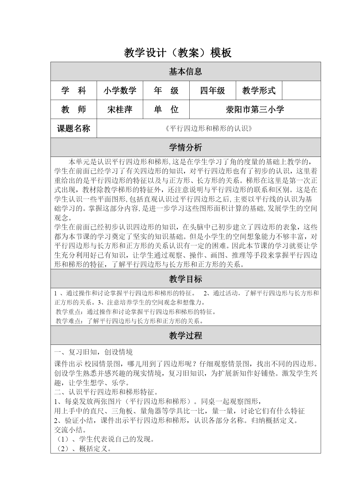 教学设计(教案)模板基本信息学科小学数学年级四年级教学形式教师宋桂萍单位荥阳市第三小学课题名称《平行四边形和梯形的认识》学情分析本单元是认识平行四边形和梯形,这是在学生学习了角的度量的基础上教学的,学生在前面已经学习了有关四边形的知识,对平行四边形也有了初步的认识,这里着重给出的是平行四边形的特征以及与正方形、长方形的关系。梯形在这里是第一次正式出现,教材除教学梯形的特征外,还注意说明与平行四边形的联系和区别。这是在学生认识一些平面图形,包括直观认识过平行四边形之后,主要以平行线的认识为基础学习的。掌握这