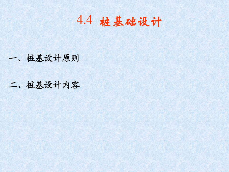 一、桩基设计原则二、桩基设计内容1、搜集设计资料2、桩的类型、截面和桩长的选择和承台埋深的确定3、桩的根数和桩位布置4、桩基验算5、桩身结构设计6、承台结构设计——钢筋混凝土桩,应用很广。制作,常用预制桩。(若高层建筑、重型设备的大直径承重桩,体积大,无法运输,则就地灌注桩)桩长:一般应选择较坚实土层作为桩端持力层。桩端全断面进入持力层的深度:黏性土、粉土大于等于2d;砂土大于等于1.5d;碎石类土大于等于1d。钢筋混凝土预制桩截面:常用正方形,圆形,必要时用管桩。中小工程常用250×250mm或300×