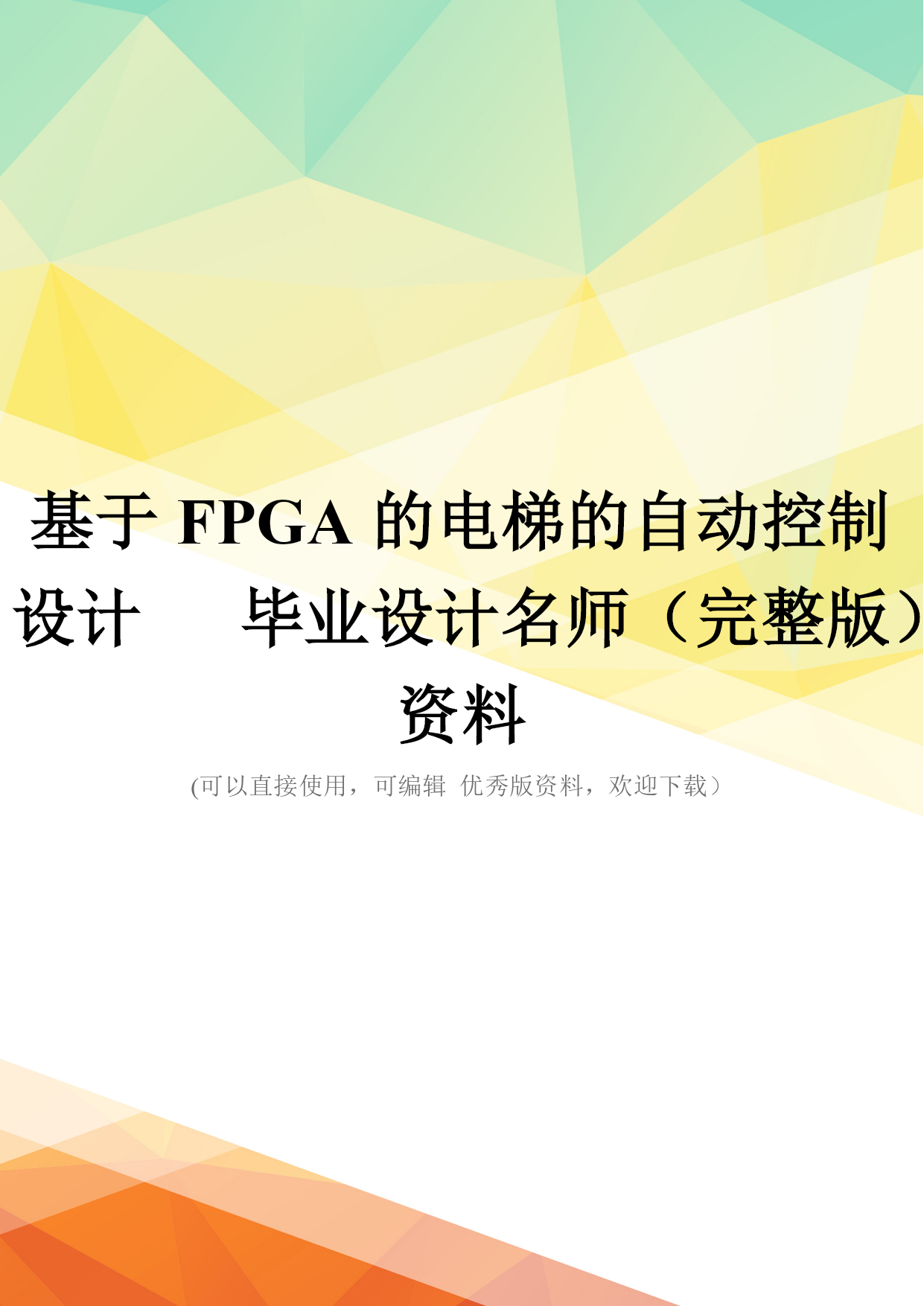 基于FPGA的电梯的自动控制设计毕业设计名师(完整版)资料(可以直接使用,可编辑优秀版资料,欢迎下载)毕业设计题目基于FPGA的电梯的自动控制设计姓名学号系部理工系专业年级09电子信息工程2班指导教师2013年5月15日中文摘要电梯作为现代化的产物,早在上个世纪就进入了我们的生活之中。大规模的经济建设尤其是蓬勃发展的房地产业给国内电梯行业开拓了更为广阔的市场。随着经济建设的持续高速发展,我国电梯需求量越来越大。由此,一个更为庞大的电梯市场已经在国内轰然形成。我国以前主要都是依靠国外的进口技术,本国的电梯厂