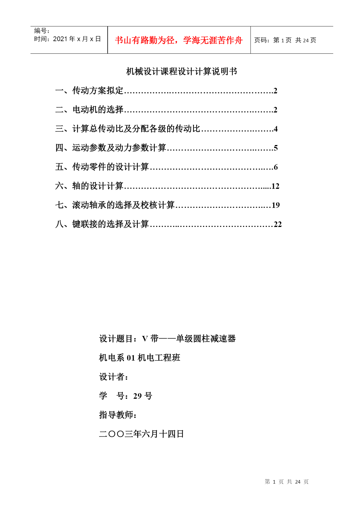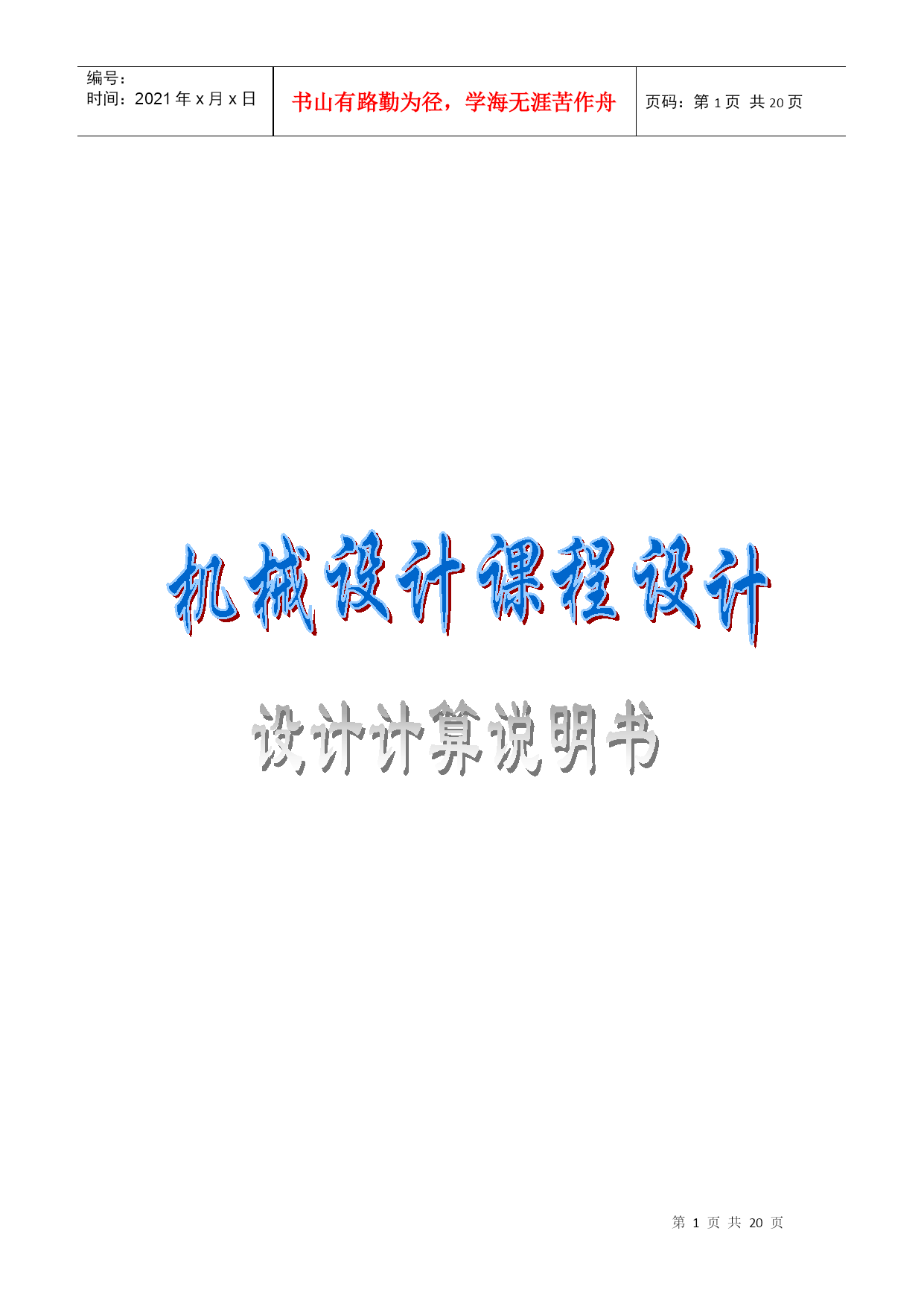 编号:时间:2021年x月x日书山有路勤为径,学海无涯苦作舟页码:第PAGE24页共NUMPAGES24页第PAGE\*MERGEFORMAT24页共NUMPAGES\*MERGEFORMAT24页机械设计课程设计计算说明书一、传动方案拟定…………….……………………………….2二、电动机的选择……………………………………….…….2三、计算总传动比及分配各级的传动比……………….…….4四、运动参数及动力参数计算………………………….…….5五、传动零件的设计计算……………………