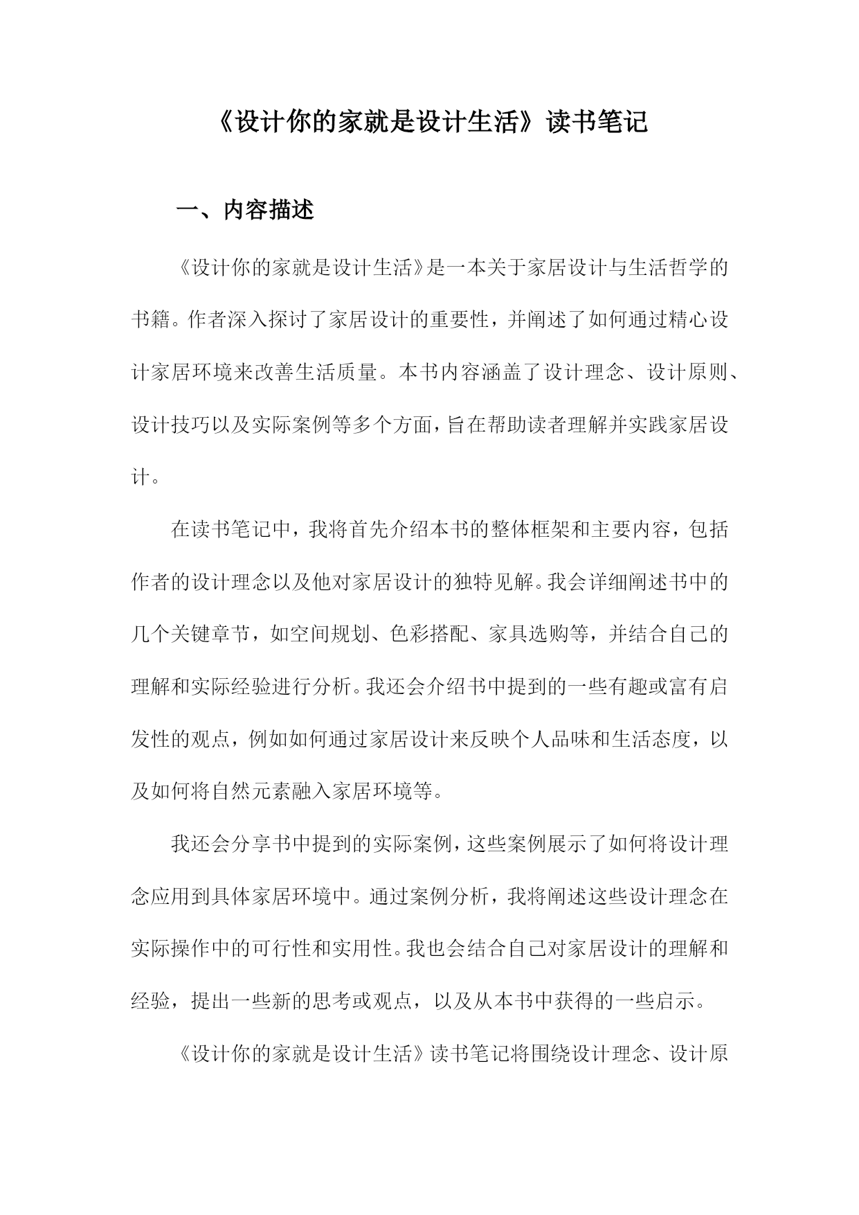 《设计你的家就是设计生活》读书笔记一、内容描述《设计你的家就是设计生活》是一本关于家居设计与生活哲学的书籍。作者深入探讨了家居设计的重要性,并阐述了如何通过精心设计家居环境来改善生活质量。本书内容涵盖了设计理念、设计原则、设计技巧以及实际案例等多个方面,旨在帮助读者理解并实践家居设计。在读书笔记中,我将首先介绍本书的整体框架和主要内容,包括作者的设计理念以及他对家居设计的独特见解。我会详细阐述书中的几个关键章节,如空间规划、色彩搭配、家具选购等,并结合自己的理解和实际经验进行分析。我还会介绍书中提到的一些