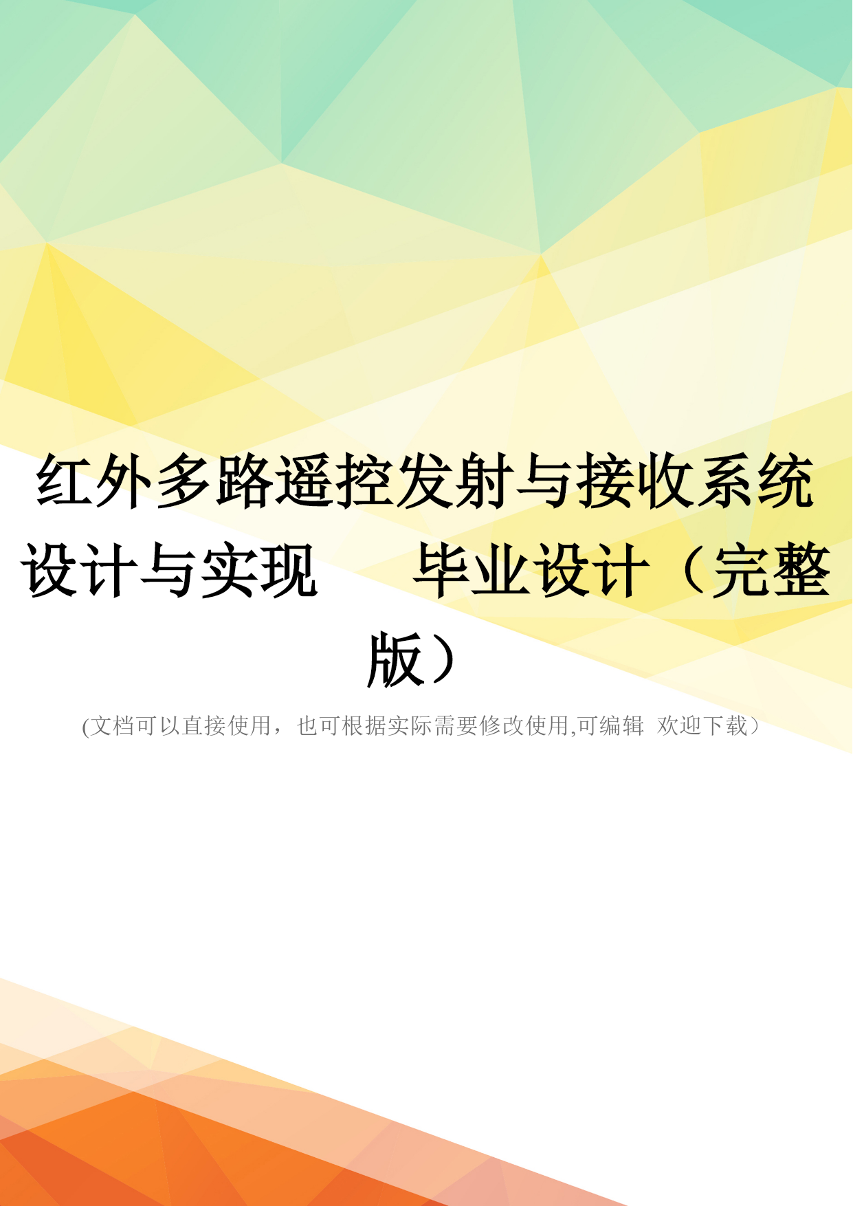 红外多路遥控发射与接收系统设计与实现毕业设计(完整版)(文档可以直接使用,也可根据实际需要修改使用,可编辑欢迎下载)目录TOC\o"1-3"\h\z\uHYPERLINK\l"_Toc388364369"摘要PAGEREF_Toc388364369\hIHYPERLINK\l"_Toc388364370"ABSTRACTPAGEREF_Toc388364370\hIIHYPERLINK\l"_Toc388364371"1绪论PAGEREF_Toc388364371\h1