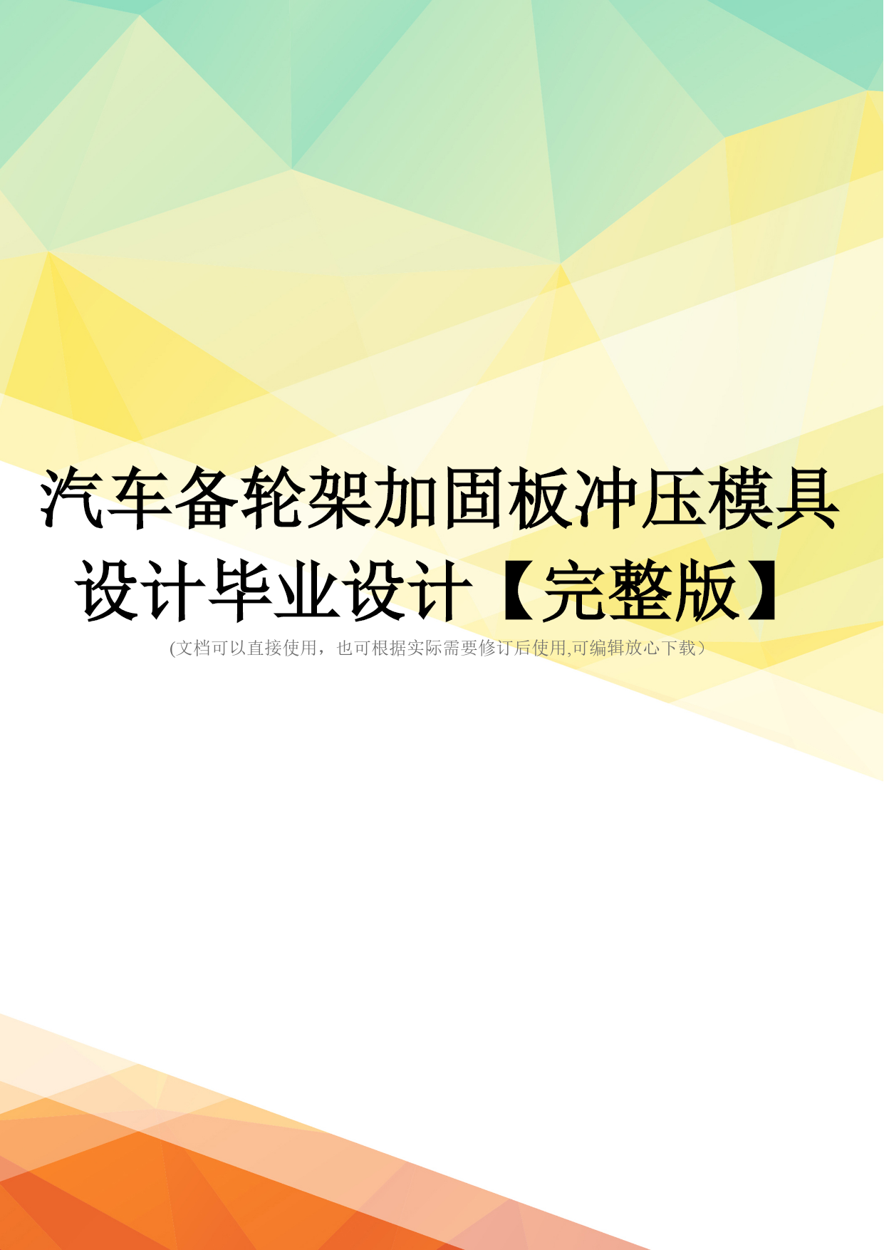 汽车备轮架加固板冲压模具设计毕业设计【完整版】(文档可以直接使用,也可根据实际需要修订后使用,可编辑放心下载)xxxxx大学毕业论文〔设计〕论文题目汽车备轮架冲压模具设计姓名xxxxx学号xxxxx院系xxxxxx专业xxxxx指导教师xxxxx职称xxxxx2021年5月目录摘要:3绪论41.模具工业在国民经济中的地位41.2冲模设计与制造方面41.3冲压设备和冲压生产自动化方面42冲压工艺设计和冲压力的计算52.1冲压件〔汽车备轮架加固板〕简介52.2冲压工艺分析和工艺方案分析6冲压的工艺分析6冲压工