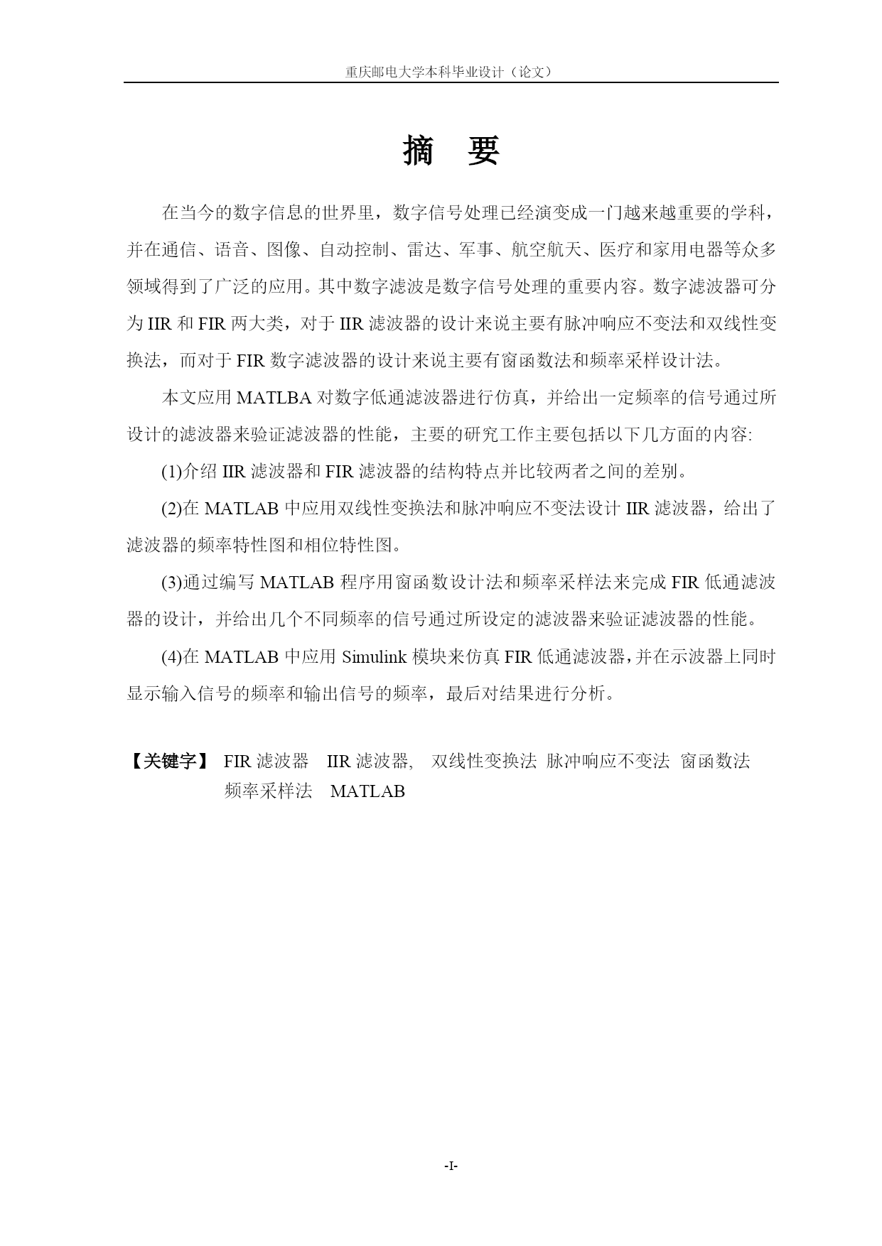 -PAGE\*MERGEFORMAT64-重庆邮电大学本科毕业设计(论文)-PAGE\*MERGEFORMAT1-摘要在当今的数字信息的世界里,数字信号处理已经演变成一门越来越重要的学科,并在通信、语音、图像、自动控制、雷达、军事、航空航天、医疗和家用电器等众多领域得到了广泛的应用。其中数字滤波是数字信号处理的重要内容。数字滤波器可分为IIR和FIR两大类,对于IIR滤波器的设计来说主要有脉冲响应不变法和双线性变换法,而对于FIR数字滤波器的设计来说主要有窗函数法和频率采样设计法。本文应用MA