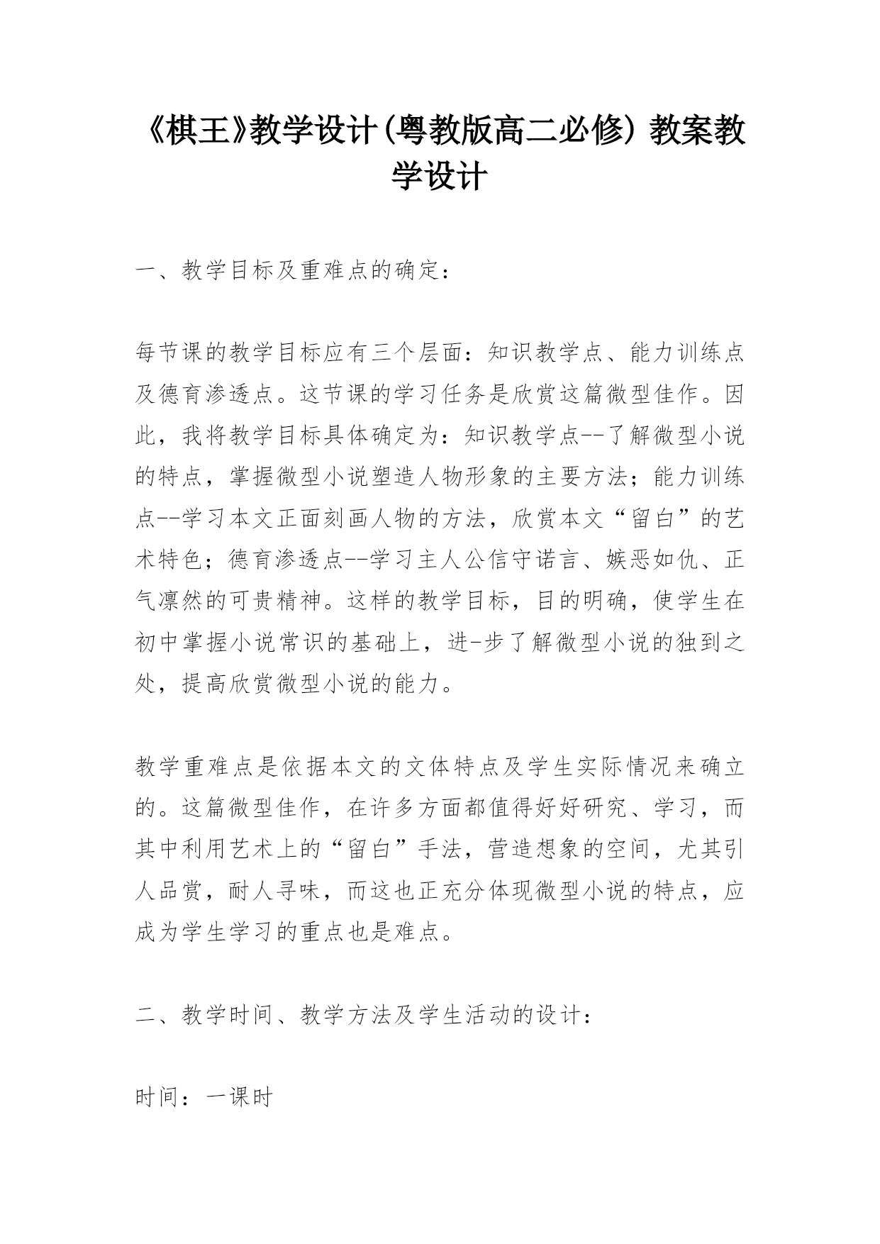 《棋王》教学设计(粤教版高二必修)教案教学设计一、教学目标及重难点的确定:每节课的教学目标应有三个层面:知识教学点、能力训练点及德育渗透点。这节课的学习任务是欣赏这篇微型佳作。因此,我将教学目标具体确定为:知识教学点--了解微型小说的特点,掌握微型小说塑造人物形象的主要方法;能力训练点--学习本文正面刻画人物的方法,欣赏本文“留白”的艺术特色;德育渗透点--学习主人公信守诺言、嫉恶如仇、正气凛然的可贵精神。这样的教学目标,目的明确,使学生在初中掌握小说常识的基础上,进-步了解微型小说的独到之处,提高欣赏微