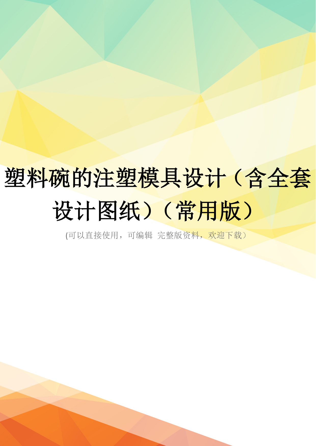 塑料碗的注塑模具设计(含全套设计图纸)(常用版)(可以直接使用,可编辑完整版资料,欢迎下载)塑料碗的注塑模具设计(含全套设计图纸)全套图纸或资料,联系695132052毕业设计说明书设计题目:塑料碗的模具设计专业:模具设计与制造目录摘要前言一、塑料的工艺性设计71、注塑模工艺..72、化学和物理特征83、塑件的尺寸与公差..71、塑件的尺寸与公差.82、塑件尺寸公差标准..83、塑料的表面质量8二、注射成型机的选择9三、型腔布局与分型面设计.91、型腔数目的确定82、型腔的布局..103、分型面的设计..