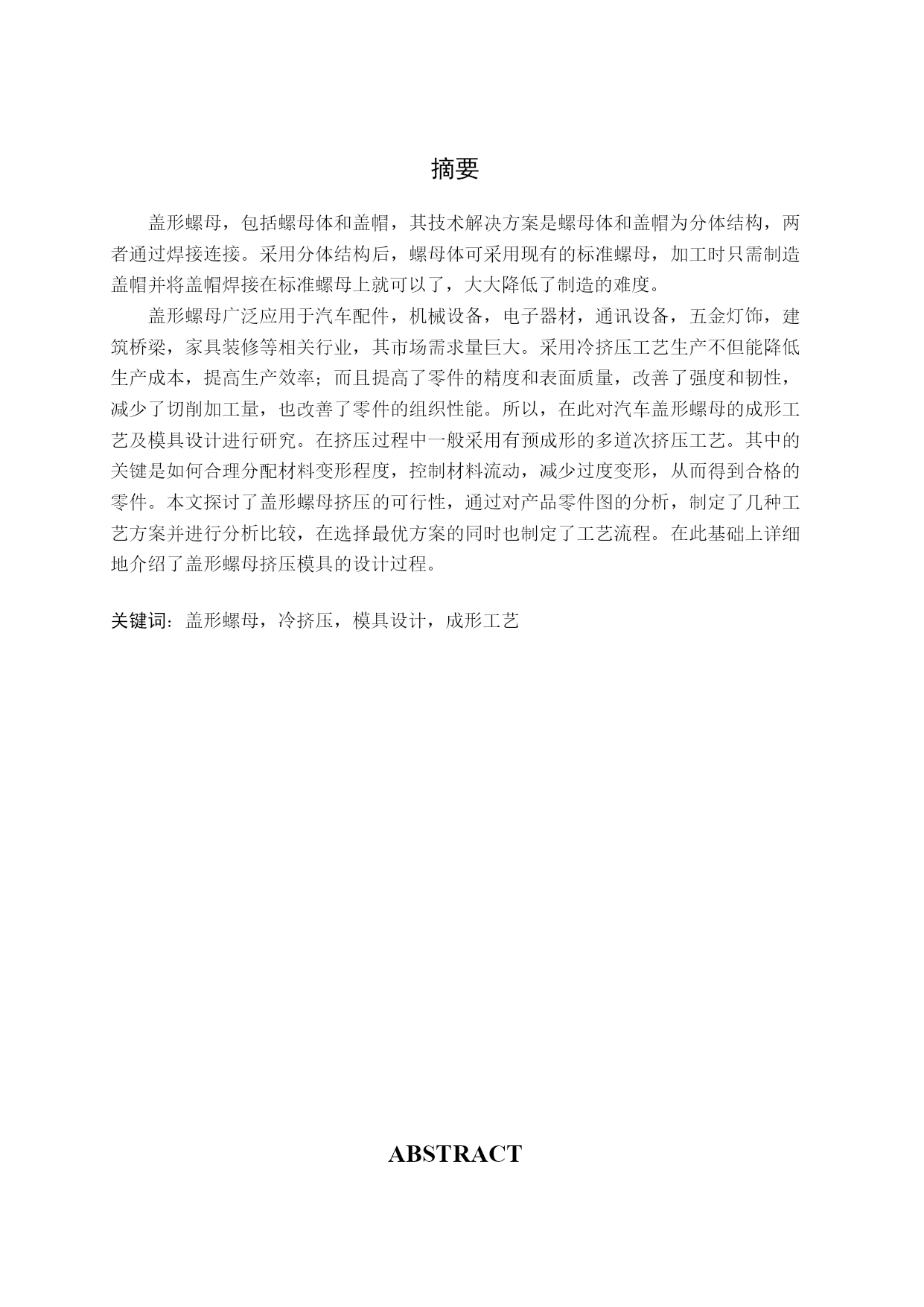 摘要盖形螺母,包括螺母体和盖帽,其技术解决方案是螺母体和盖帽为分体结构,两者通过焊接连接。采用分体结构后,螺母体可采用现有的标准螺母,加工时只需制造盖帽并将盖帽焊接在标准螺母上就可以了,大大降低了制造的难度。盖形螺母广泛应用于汽车配件,机械设备,电子器材,通讯设备,五金灯饰,建筑桥梁,家具装修等相关行业,其市场需求量巨大。采用冷挤压工艺生产不但能降低生产成本,提高生产效率;而且提高了零件的精度和表面质量,改善了强度和韧性,减少了切削加工量,也改善了零件的组织性能。所以,在此对汽车盖形螺母的成形工艺及模具设