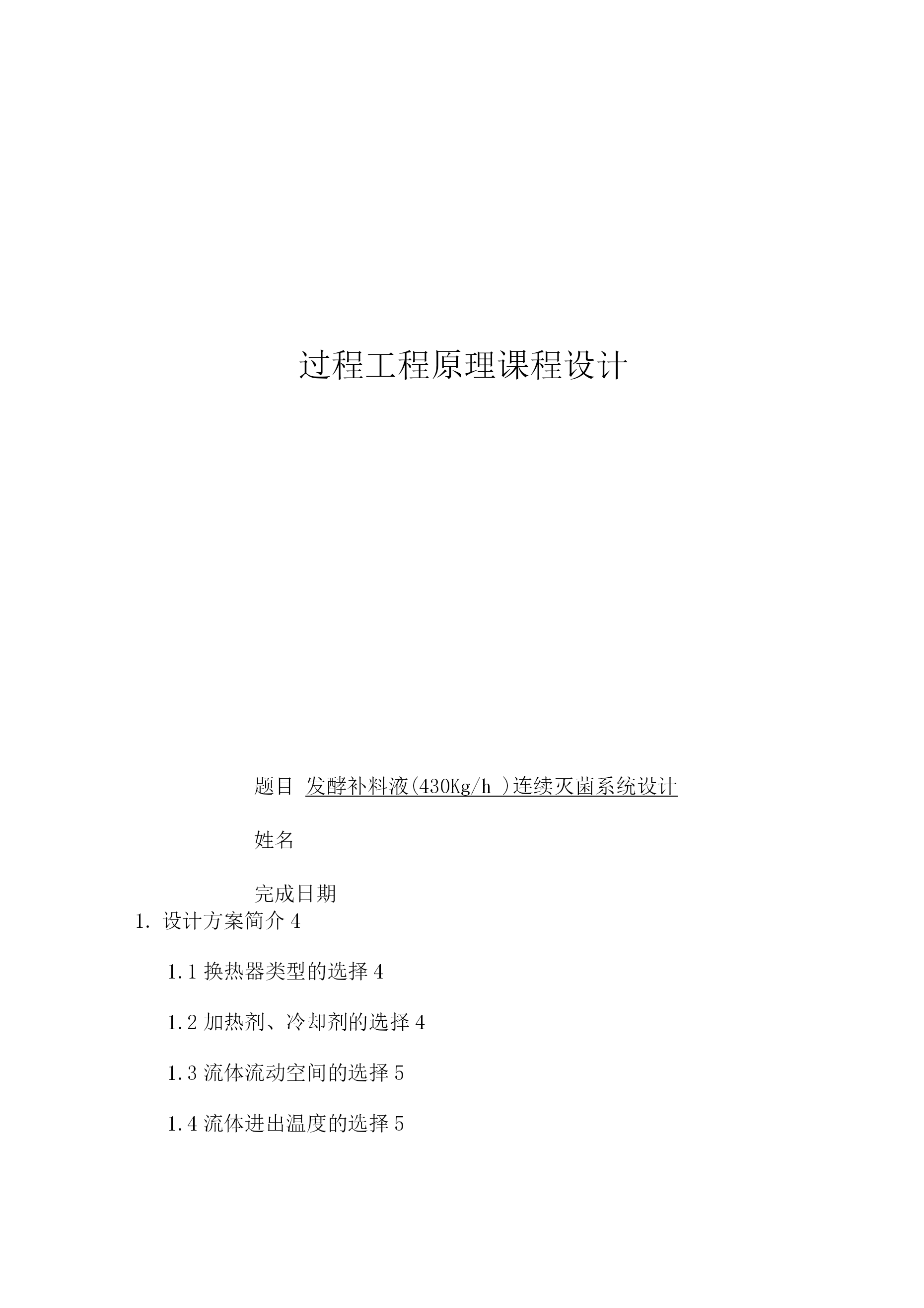 过程工程原理课程设计题目发酵补料液(430Kg/h)连续灭菌系统设计姓名完成日期TOC\o"1-5"\h\z设计方案简介41.1换热器类型的选择41.2加热剂、冷却剂的选择41.3流体流动空间的选择51.4流体进出温度的选择51.5换热器材质的选择51.6初步流程图6工艺计算72.1换热器(加热器)计算72.1.1热量计算72.1.2K值A值计算72.1.3管壁温度92.1.4壳体壁温92.1.5温度补偿92.2冷却器1计算92.2.1热量计算92.2.2面积A与K值计算102.2.3管壁温度112.