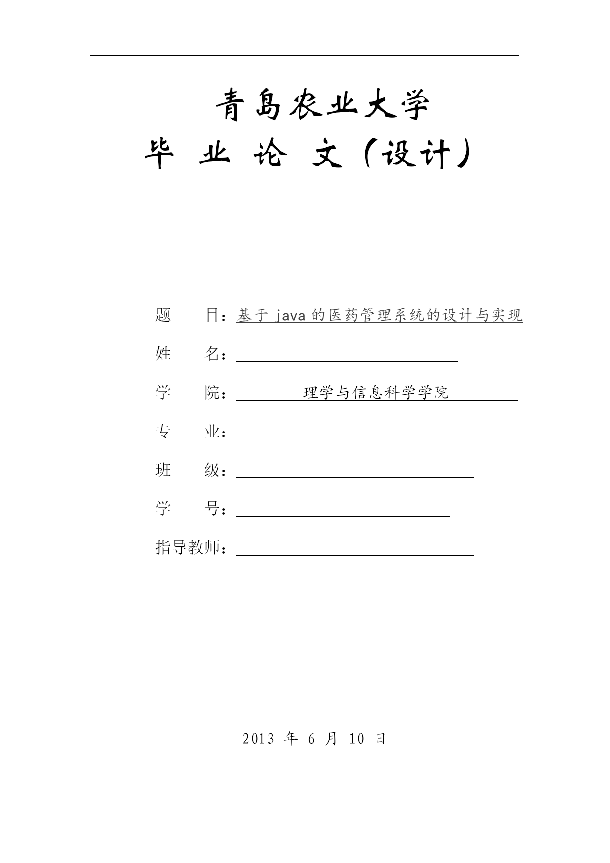PAGE青岛农业大学毕业论文(设计)题目:基于java的医药管理系统的设计与实现姓名:学院:理学与信息科学学院专业:班级:学号:指导教师:2013年6月10日毕业论文(设计)诚信声明本人声明:所呈交的毕业论文(设计)是在导师指导下进行的研究工作及取得的研究成果,论文中引用他人的文献、数据、图表、资料均已作明确标注,论文中的结论和成果为本人独立完成,真实可靠,不包含他人成果及已获得青岛农业大学或其他教育机构的学位或证书使用过的材料。与我一同工作的同志对本研究所做的任何贡献均已在论文中作了明确的说明并表