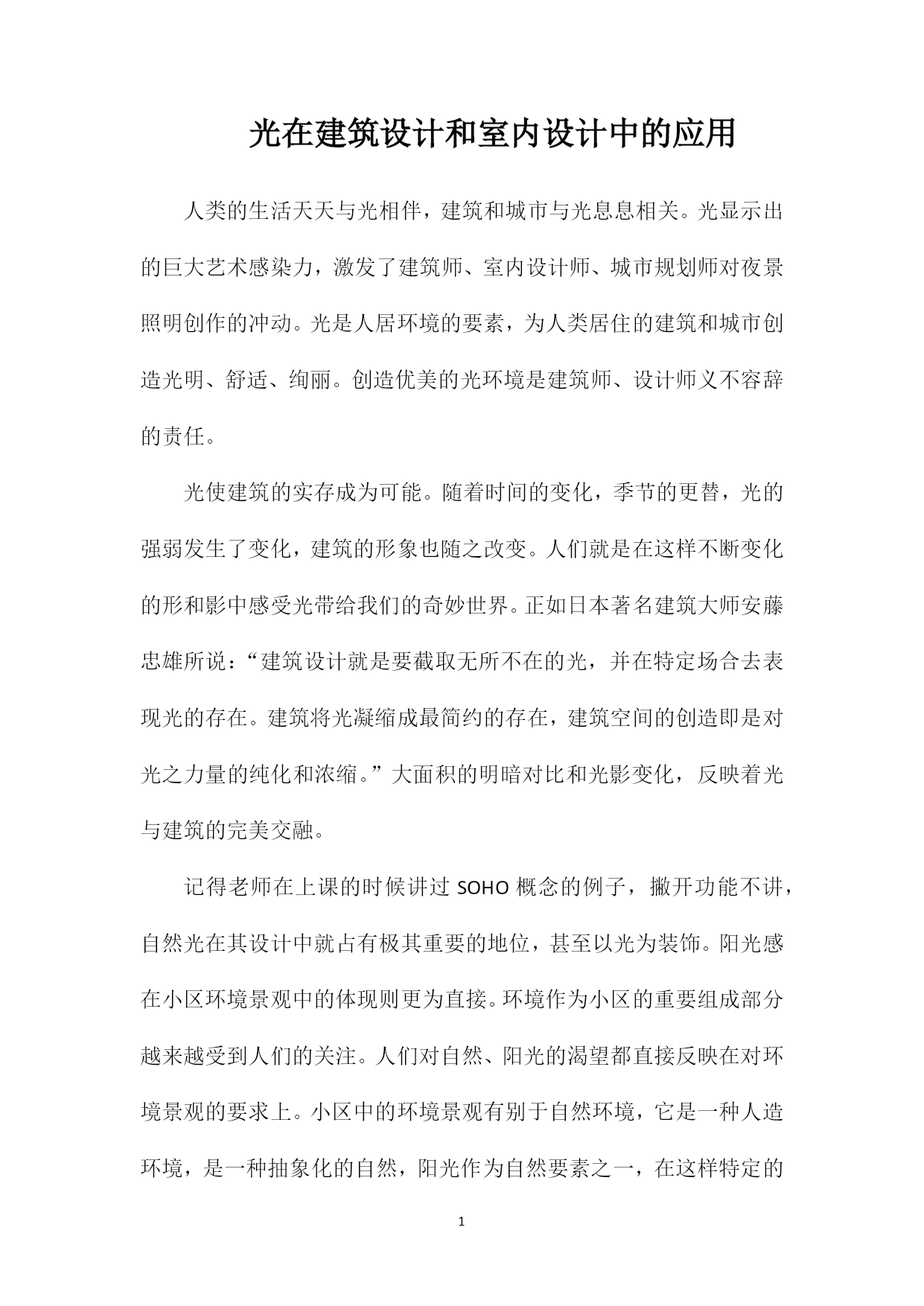 PAGEPAGE11光在建筑设计和室内设计中的应用人类的生活天天与光相伴,建筑和城市与光息息相关。光显示出的巨大艺术感染力,激发了建筑师、室内设计师、城市规划师对夜景照明创作的冲动。光是人居环境的要素,为人类居住的建筑和城市创造光明、舒适、绚丽。创造优美的光环境是建筑师、设计师义不容辞的责任。光使建筑的实存成为可能。随着时间的变化,季节的更替,光的强弱发生了变化,建筑的形象也随之改变。人们就是在这样不断变化的形和影中感受光带给我们的奇妙世界。正如日本著名建筑大师安藤忠雄所说:“建筑设计就是要截