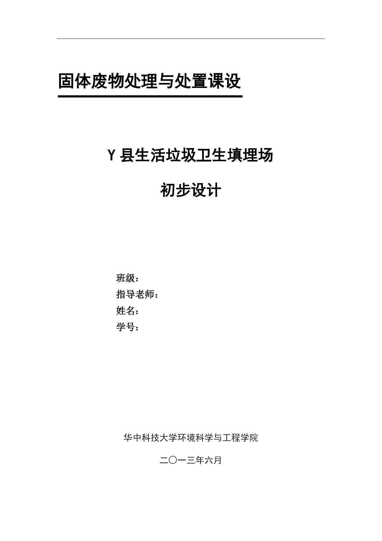 固体废物处理与处置课设Y县生活垃圾卫生填埋场初步设计班级:指导老师:姓名:学号:华中科技大学环境科学与工程学院二○一三年六月目录第一章概述11.1工程名称、地点与建设主管单位11.2设计依据和基础资料11.3有关法规与设计标准21.4设计原则31.5设计范围4第二章Y县概况及自然条件52.1城市概况与气象水文条件52.2地形地貌概况52.3地质构造6第三章项目建设必要性与可行性83.1环境卫生状况83.2Y县城区垃圾成分及特性分析83.3处理工艺的选择133.4服务年限及垃圾产量估算(列出计算公式,表格)