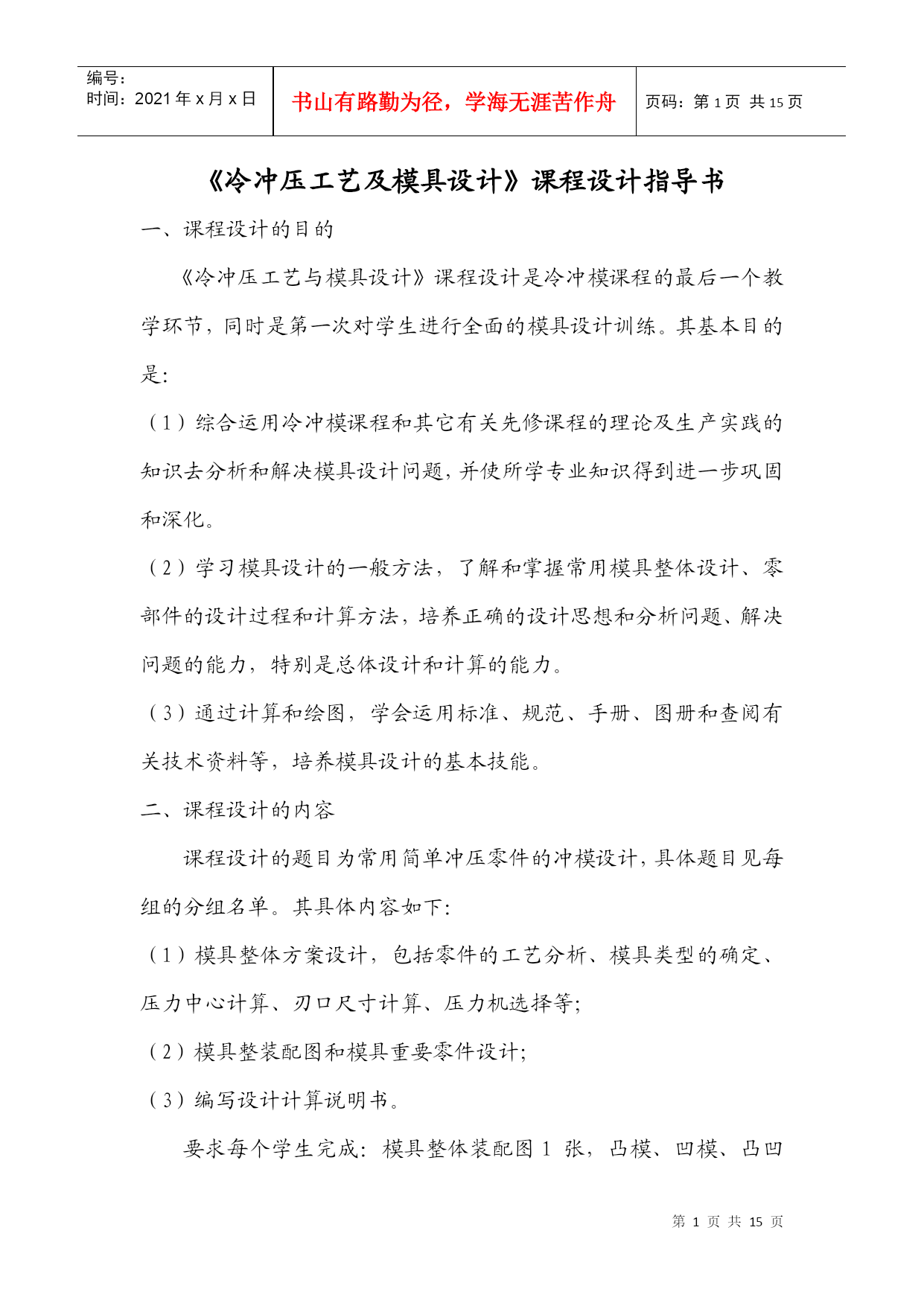编号:时间:2021年x月x日书山有路勤为径,学海无涯苦作舟页码:第PAGE15页共NUMPAGES15页第PAGE\*MERGEFORMAT15页共NUMPAGES\*MERGEFORMAT15页《冷冲压工艺及模具设计》课程设计指导书一、课程设计的目的《冷冲压工艺与模具设计》课程设计是冷冲模课程的最后一个教学环节,同时是第一次对学生进行全面的模具设计训练。其基本目的是:(1)综合运用冷冲模课程和其它有关先修课程的理论及生产实践的知识去分析和解决模具设计问题,并使所学专业知识得到进