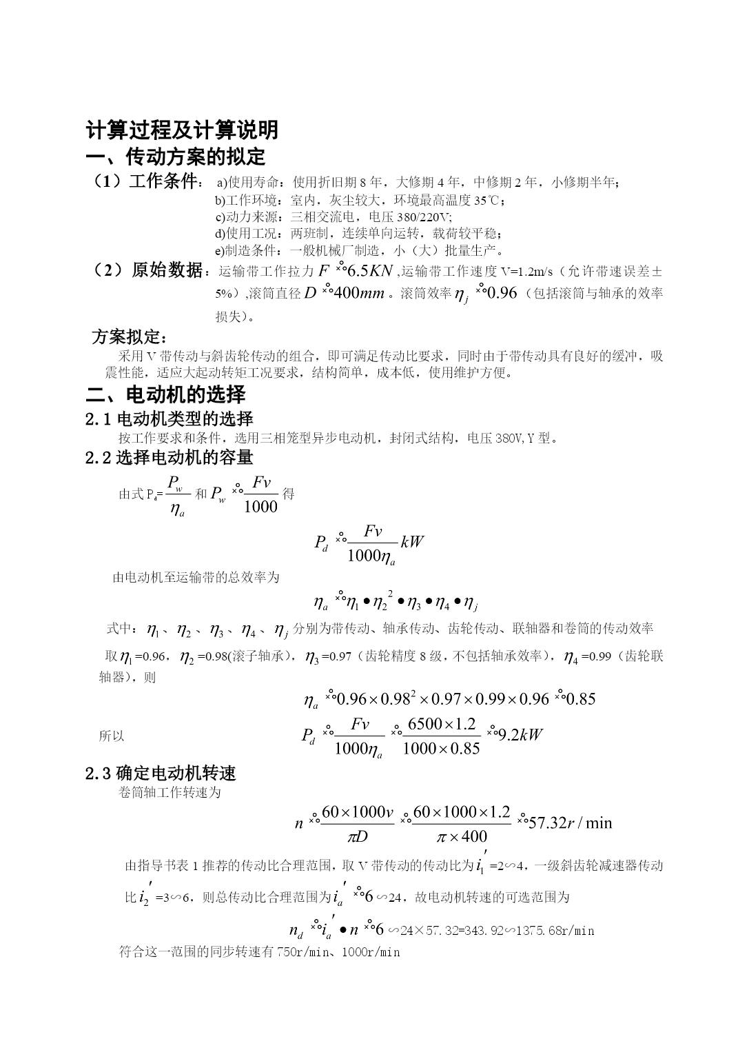 计算过程及计算说明一、传动方案的拟定(1)工作条件:a)使用寿命:使用折旧期8年,大修期4年,中修期2年,小修期半年;b)工作环境:室内,灰尘较大,环境最高温度35℃;c)动力来源:三相交流电,电压380/220V;d)使用工况:两班制,连续单向运转,载荷较平稳;e)制造条件:一般机械厂制造,小(大)批量生产。(2)原始数据:运输带工作拉力,运输带工作速度V=1.2m/s(允许带速误差±5%),滚筒直径。滚筒效率(包括滚筒与轴承的效率损失)。方案拟定:采用V带传动与斜齿轮传动的组合,即可满足传动比要求,同