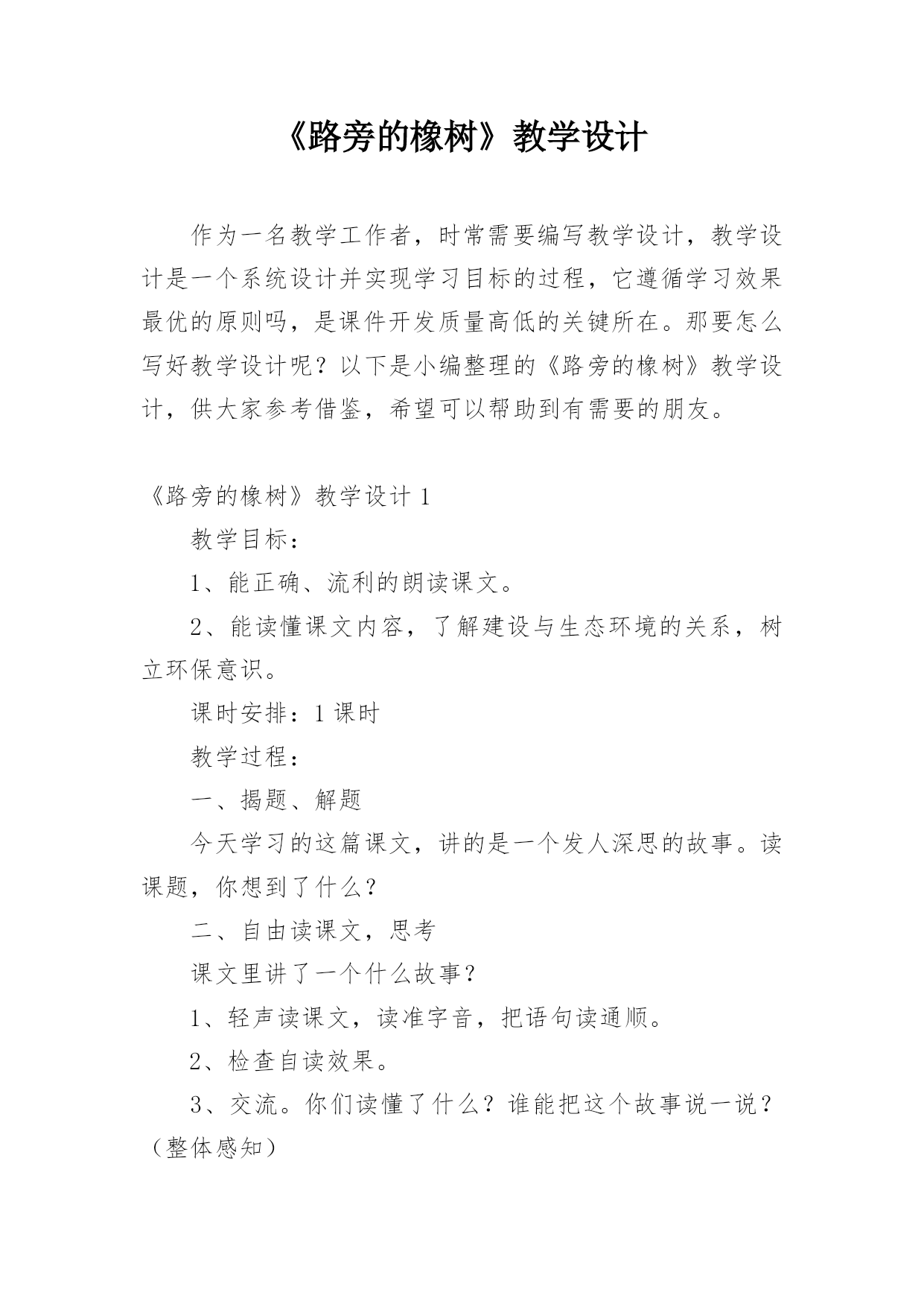 《路旁的橡树》教学设计作为一名教学工作者,时常需要编写教学设计,教学设计是一个系统设计并实现学习目标的过程,它遵循学习效果最优的原则吗,是课件开发质量高低的关键所在。那要怎么写好教学设计呢?以下是小编整理的《路旁的橡树》教学设计,供大家参考借鉴,希望可以帮助到有需要的朋友。《路旁的橡树》教学设计1教学目标:1、能正确、流利的朗读课文。2、能读懂课文内容,了解建设与生态环境的关系,树立环保意识。课时安排:1课时教学过程:一、揭题、解题今天学习的这篇课文,讲的是一个发人深思的故事。读课题,你想到了什么?二、自