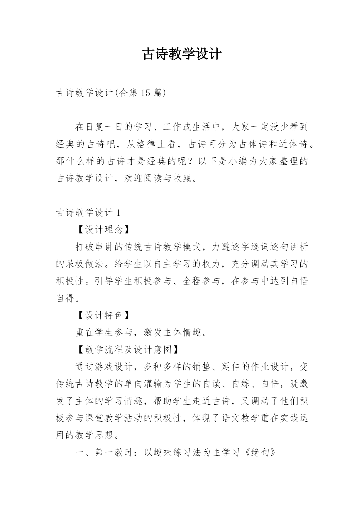 古诗教学设计古诗教学设计(合集15篇)在日复一日的学习、工作或生活中,大家一定没少看到经典的古诗吧,从格律上看,古诗可分为古体诗和近体诗。那什么样的古诗才是经典的呢?以下是小编为大家整理的古诗教学设计,欢迎阅读与收藏。古诗教学设计1【设计理念】打破串讲的传统古诗教学模式,力避逐字逐词逐句讲析的呆板做法。给学生以自主学习的权力,充分调动其学习的积极性。引导学生积极参与、全程参与,在参与中达到自悟自得。【设计特色】重在学生参与,激发主体情趣。【教学流程及设计意图】通过游戏设计,多种多样的铺垫、延伸的作业设计,