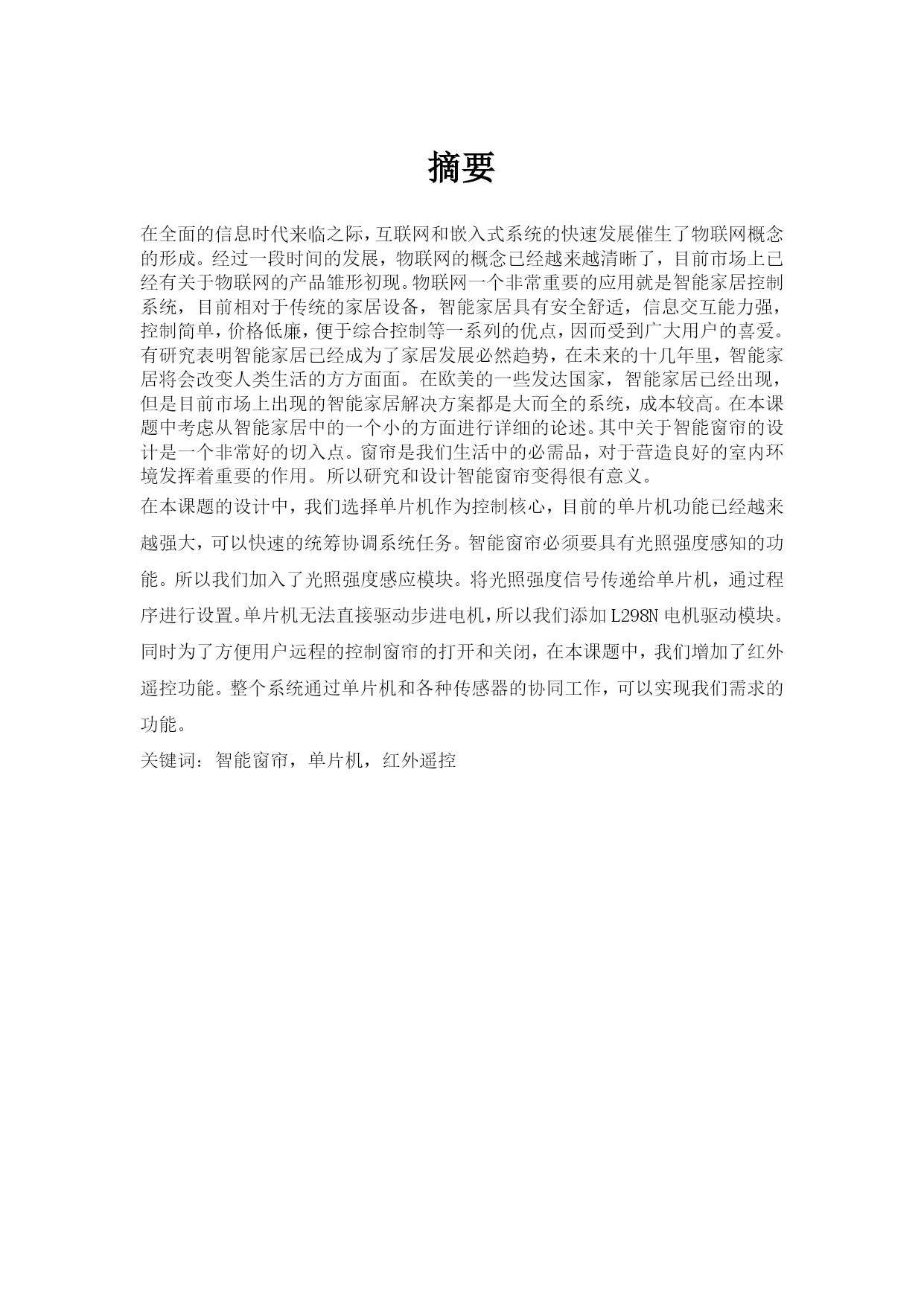 摘要在全面的信息时代来临之际,互联网和嵌入式系统的快速发展催生了物联网概念的形成。经过一段时间的发展,物联网的概念已经越来越清晰了,目前市场上已经有关于物联网的产品雏形初现。物联网一个非常重要的应用就是智能家居控制系统,目前相对于传统的家居设备,智能家居具有安全舒适,信息交互能力强,控制简单,价格低廉,便于综合控制等一系列的优点,因而受到广大用户的喜爱。有研究表明智能家居已经成为了家居发展必然趋势,在未来的十几年里,智能家居将会改变人类生活的方方面面。在欧美的一些发达国家,智能家居已经出现,但是目前市场上