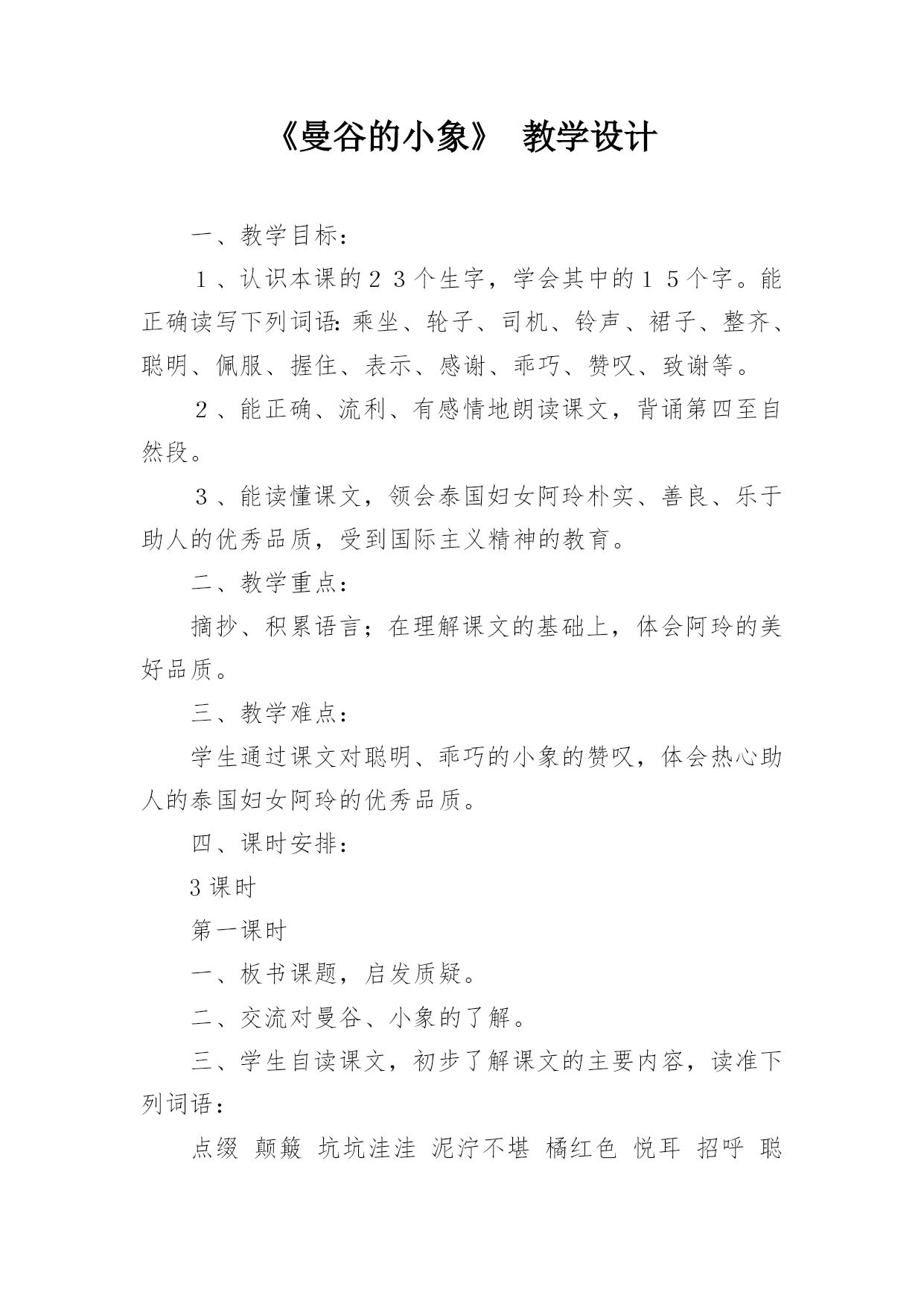 《曼谷的小象》教学设计一、教学目标:1、认识本课的23个生字,学会其中的15个字。能正确读写下列词语:乘坐、轮子、司机、铃声、裙子、整齐、聪明、佩服、握住、表示、感谢、乖巧、赞叹、致谢等。2、能正确、流利、有感情地朗读课文,背诵第四至自然段。3、能读懂课文,领会泰国妇女阿玲朴实、善良、乐于助人的优秀品质,受到国际主义精神的教育。二、教学重点:摘抄、积累语言;在理解课文的基础上,体会阿玲的美好品质。三、教学难点:学生通过课文对聪明、乖巧的小象的赞叹,体会热心助人的泰国妇女阿玲的优秀品质。四、课时安排:3课时