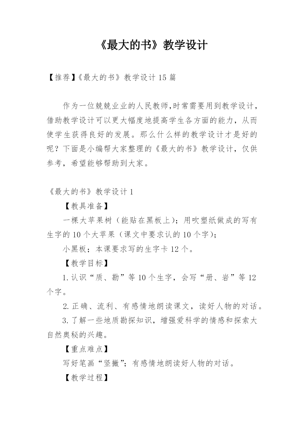 《最大的书》教学设计【推荐】《最大的书》教学设计15篇作为一位兢兢业业的人民教师,时常需要用到教学设计,借助教学设计可以更大幅度地提高学生各方面的能力,从而使学生获得良好的发展。那么什么样的教学设计才是好的呢?下面是小编帮大家整理的《最大的书》教学设计,仅供参考,希望能够帮助到大家。《最大的书》教学设计1【教具准备】一棵大苹果树(能贴在黑板上);用吹塑纸做成的写有生字的10个大苹果(课文中要求认的10个字);小黑板;本课要求写的生字卡12个。【教学目标】1.认识“质、勘”等10个生字,会写“册、岩”等12