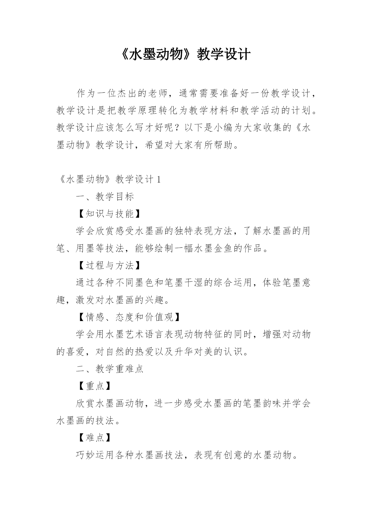 《水墨动物》教学设计作为一位杰出的老师,通常需要准备好一份教学设计,教学设计是把教学原理转化为教学材料和教学活动的计划。教学设计应该怎么写才好呢?以下是小编为大家收集的《水墨动物》教学设计,希望对大家有所帮助。《水墨动物》教学设计1一、教学目标【知识与技能】学会欣赏感受水墨画的独特表现方法,了解水墨画的用笔、用墨等技法,能够绘制一幅水墨金鱼的作品。【过程与方法】通过各种不同墨色和笔墨干湿的综合运用,体验笔墨意趣,激发对水墨画的兴趣。【情感、态度和价值观】学会用水墨艺术语言表现动物特征的同时,增强对动物的喜
