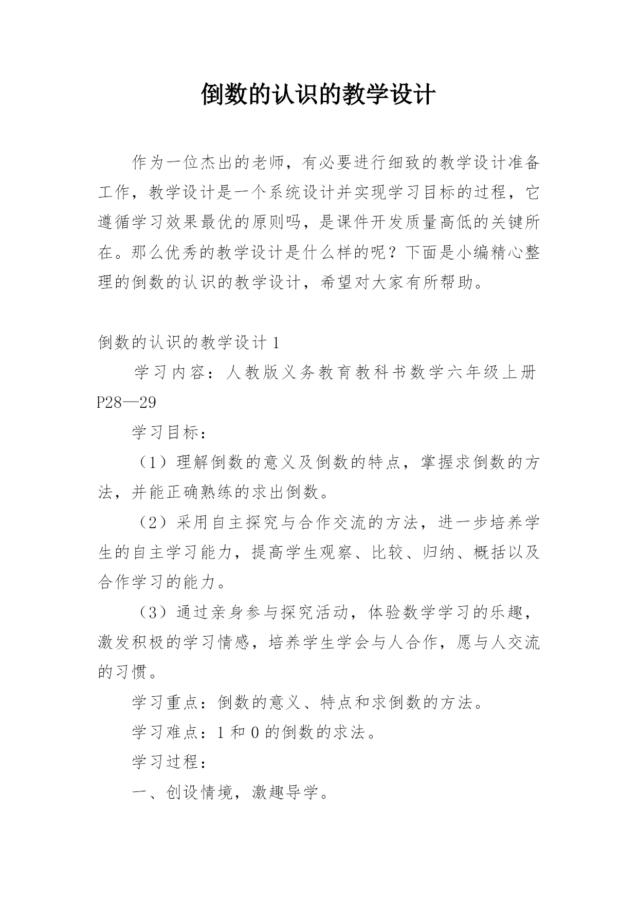 倒数的认识的教学设计作为一位杰出的老师,有必要进行细致的教学设计准备工作,教学设计是一个系统设计并实现学习目标的过程,它遵循学习效果最优的原则吗,是课件开发质量高低的关键所在。那么优秀的教学设计是什么样的呢?下面是小编精心整理的倒数的认识的教学设计,希望对大家有所帮助。倒数的认识的教学设计1学习内容:人教版义务教育教科书数学六年级上册P28—29学习目标:(1)理解倒数的意义及倒数的特点,掌握求倒数的方法,并能正确熟练的求出倒数。(2)采用自主探究与合作交流的方法,进一步培养学生的自主学习能力,提高学生观