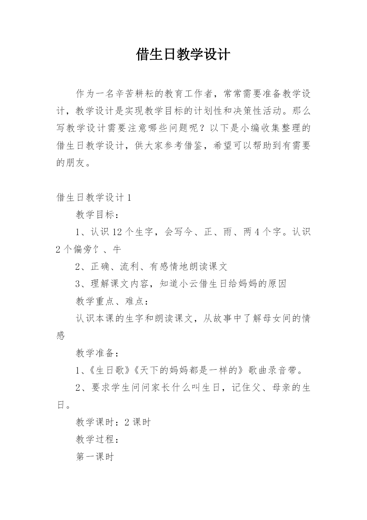 借生日教学设计作为一名辛苦耕耘的教育工作者,常常需要准备教学设计,教学设计是实现教学目标的计划性和决策性活动。那么写教学设计需要注意哪些问题呢?以下是小编收集整理的借生日教学设计,供大家参考借鉴,希望可以帮助到有需要的朋友。借生日教学设计1教学目标:1、认识12个生字,会写今、正、雨、两4个字。认识2个偏旁饣、牛2、正确、流利、有感情地朗读课文3、理解课文内容,知道小云借生日给妈妈的原因教学重点、难点:认识本课的生字和朗读课文,从故事中了解母女间的情感教学准备:1、《生日歌》《天下的妈妈都是一样的》歌曲录
