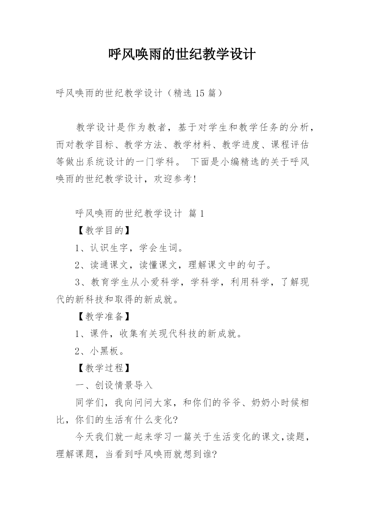 呼风唤雨的世纪教学设计呼风唤雨的世纪教学设计(精选15篇)教学设计是作为教者,基于对学生和教学任务的分析,而对教学目标、教学方法、教学材料、教学进度、课程评估等做出系统设计的一门学科。下面是小编精选的关于呼风唤雨的世纪教学设计,欢迎参考!呼风唤雨的世纪教学设计篇1【教学目的】1、认识生字,学会生词。2、读通课文,读懂课文,理解课文中的句子。3、教育学生从小爱科学,学科学,利用科学,了解现代的新科技和取得的新成就。【教学准备】1、课件,收集有关现代科技的新成就。2、小黑板。【教学过程】一、创设情景导入同学们