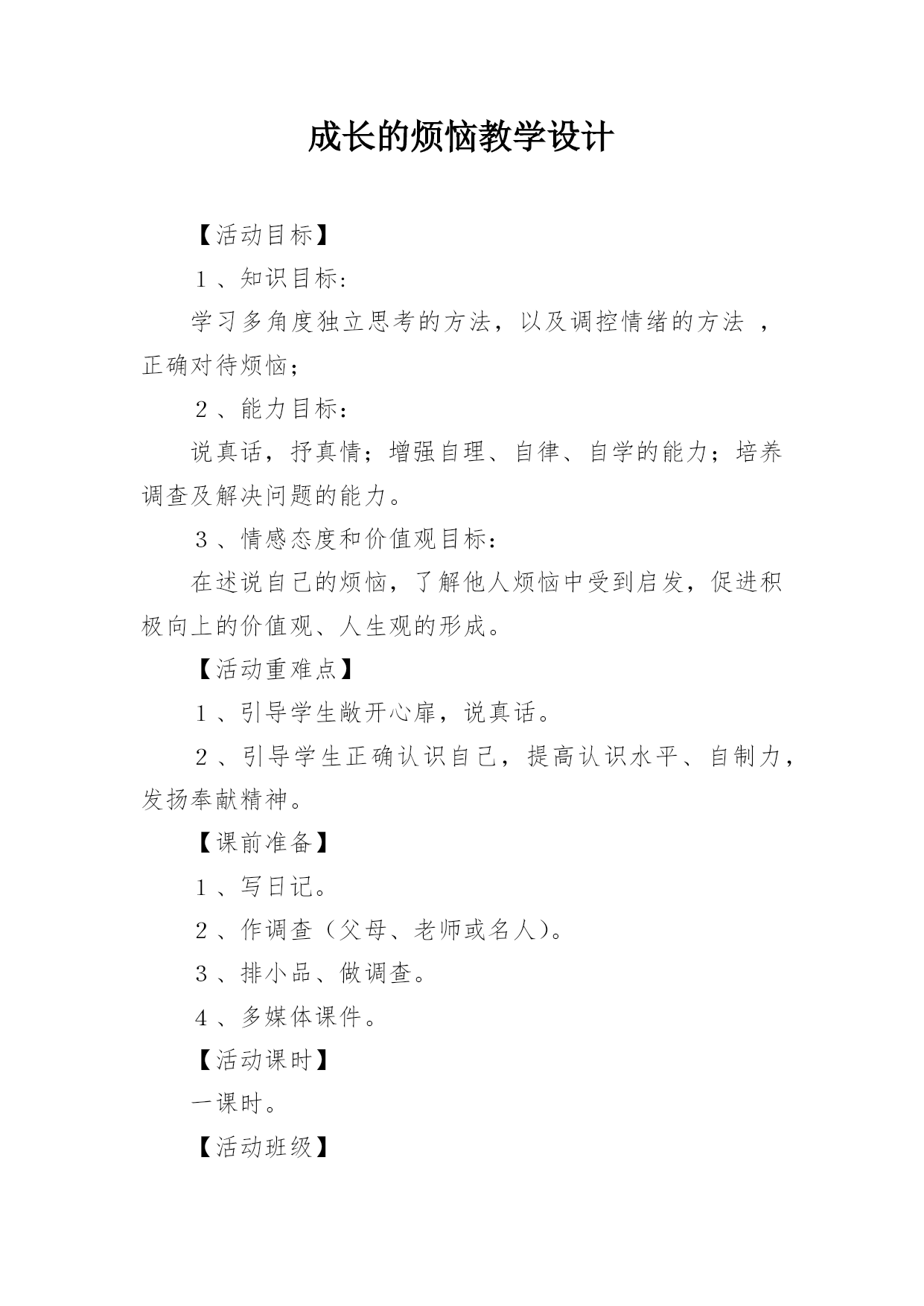 成长的烦恼教学设计【活动目标】1、知识目标:学习多角度独立思考的方法,以及调控情绪的方法,正确对待烦恼;2、能力目标:说真话,抒真情;增强自理、自律、自学的能力;培养调查及解决问题的能力。3、情感态度和价值观目标:在述说自己的烦恼,了解他人烦恼中受到启发,促进积极向上的价值观、人生观的形成。【活动重难点】1、引导学生敞开心扉,说真话。2、引导学生正确认识自己,提高认识水平、自制力,发扬奉献精神。【课前准备】1、写日记。2、作调查(父母、老师或名人)。3、排小品、做调查。4、多媒体课件。【活动课时】一课时。