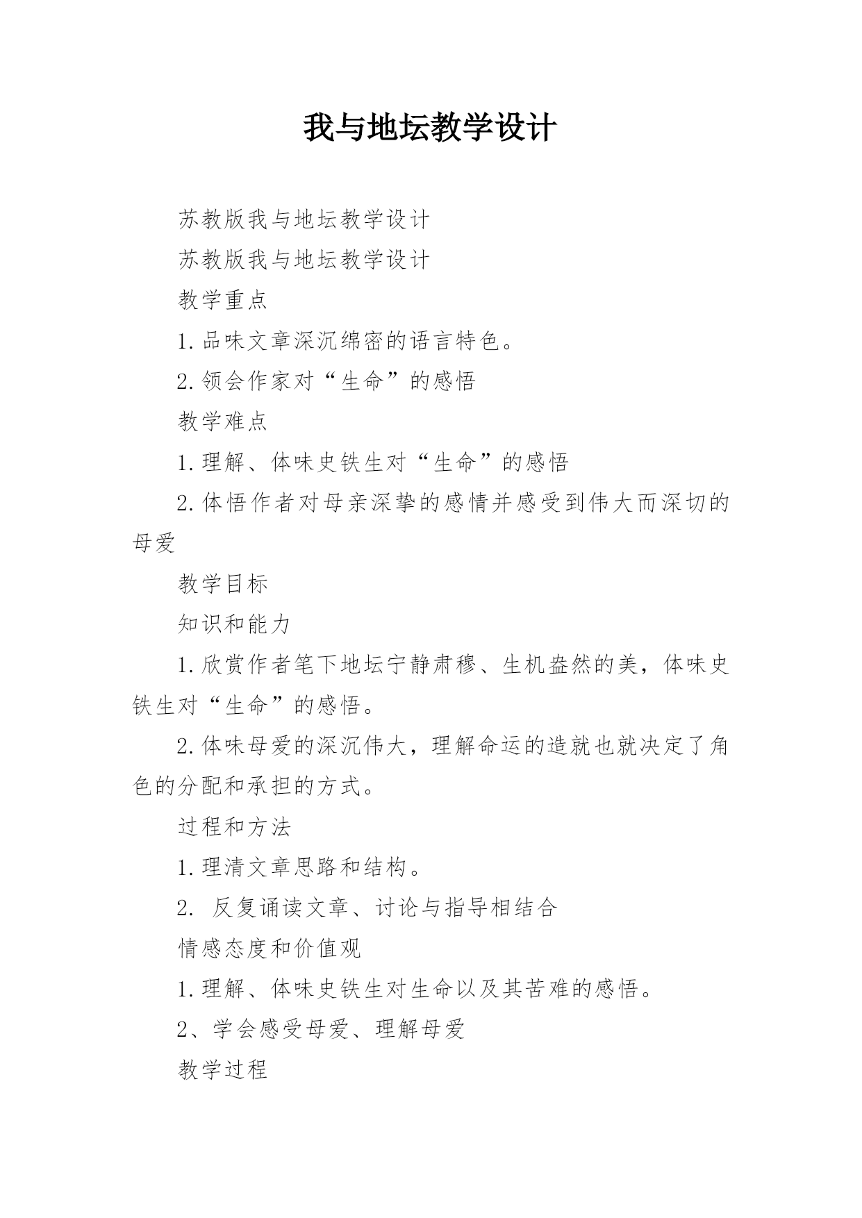 我与地坛教学设计苏教版我与地坛教学设计苏教版我与地坛教学设计教学重点1.品味文章深沉绵密的语言特色。2.领会作家对“生命”的感悟教学难点1.理解、体味史铁生对“生命”的感悟2.体悟作者对母亲深挚的感情并感受到伟大而深切的母爱教学目标知识和能力1.欣赏作者笔下地坛宁静肃穆、生机盎然的美,体味史铁生对“生命”的感悟。2.体味母爱的深沉伟大,理解命运的造就也就决定了角色的分配和承担的方式。过程和方法1.理清文章思路和结构。2.反复诵读文章、讨论与指导相结合情感态度和价值观1.理解、体味史铁生对生命以及其苦难的感