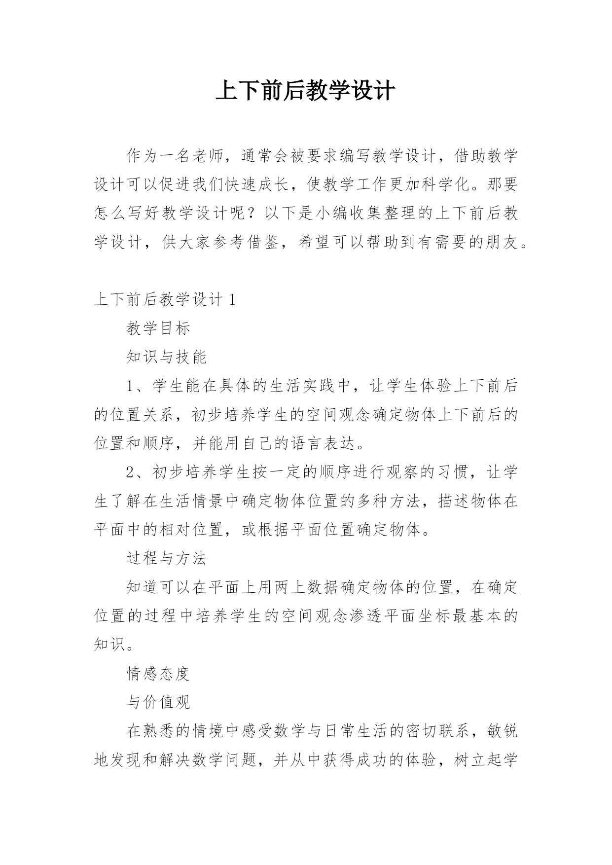 上下前后教学设计作为一名老师,通常会被要求编写教学设计,借助教学设计可以促进我们快速成长,使教学工作更加科学化。那要怎么写好教学设计呢?以下是小编收集整理的上下前后教学设计,供大家参考借鉴,希望可以帮助到有需要的朋友。上下前后教学设计1教学目标知识与技能1、学生能在具体的生活实践中,让学生体验上下前后的位置关系,初步培养学生的空间观念确定物体上下前后的位置和顺序,并能用自己的语言表达。2、初步培养学生按一定的顺序进行观察的习惯,让学生了解在生活情景中确定物体位置的多种方法,描述物体在平面中的相对位置,或根
