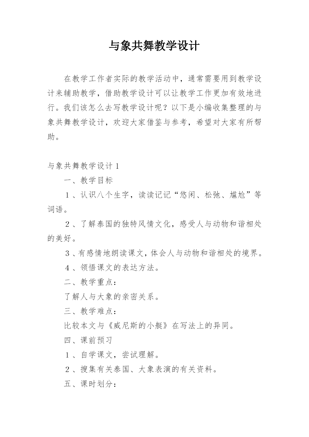 与象共舞教学设计在教学工作者实际的教学活动中,通常需要用到教学设计来辅助教学,借助教学设计可以让教学工作更加有效地进行。我们该怎么去写教学设计呢?以下是小编收集整理的与象共舞教学设计,欢迎大家借鉴与参考,希望对大家有所帮助。与象共舞教学设计1一、教学目标1、认识八个生字,读读记记“悠闲、松弛、尴尬”等词语。2、了解泰国的独特风情文化,感受人与动物和谐相处的美好。3、有感情地朗读课文,体会人与动物和谐相处的境界。4、领悟课文的表达方法。二、教学重点:了解人与大象的亲密关系。三、教学难点:比较本文与《威尼斯的