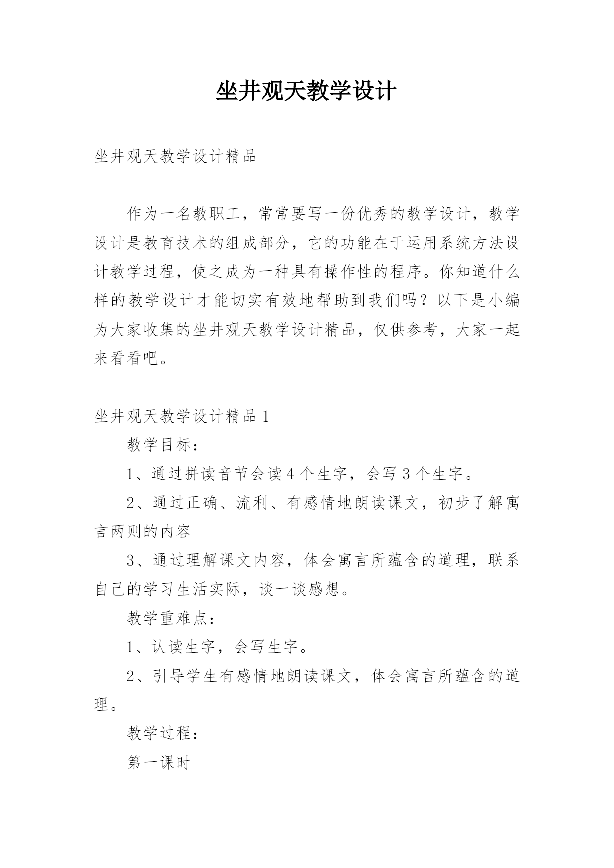 坐井观天教学设计坐井观天教学设计精品作为一名教职工,常常要写一份优秀的教学设计,教学设计是教育技术的组成部分,它的功能在于运用系统方法设计教学过程,使之成为一种具有操作性的程序。你知道什么样的教学设计才能切实有效地帮助到我们吗?以下是小编为大家收集的坐井观天教学设计精品,仅供参考,大家一起来看看吧。坐井观天教学设计精品1教学目标:1、通过拼读音节会读4个生字,会写3个生字。2、通过正确、流利、有感情地朗读课文,初步了解寓言两则的内容3、通过理解课文内容,体会寓言所蕴含的道理,联系自己的学习生活实际,谈一谈