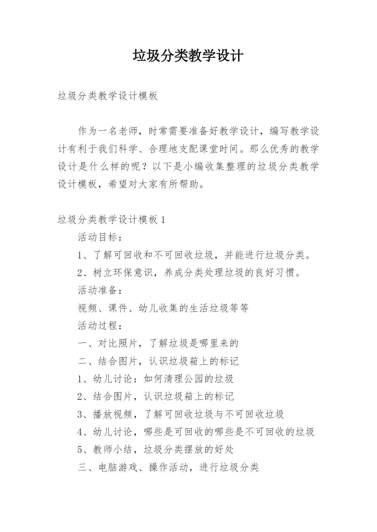 垃圾分类教学设计垃圾分类教学设计模板作为一名老师,时常需要准备好教学设计,编写教学设计有利于我们科学、合理地支配课堂时间。那么优秀的教学设计是什么样的呢?以下是小编收集整理的垃圾分类教学设计模板,希望对大家有所帮助。垃圾分类教学设计模板1活动目标:1、了解可回收和不可回收垃圾,并能进行垃圾分类。2、树立环保意识,养成分类处理垃圾的良好习惯。活动准备:视频、课件、幼儿收集的生活垃圾等等活动过程:一、对比照片,了解垃圾是哪里来的二、结合图片,认识垃圾箱上的标记1、幼儿讨论:如何清理公园的垃圾2、结合图片,认识