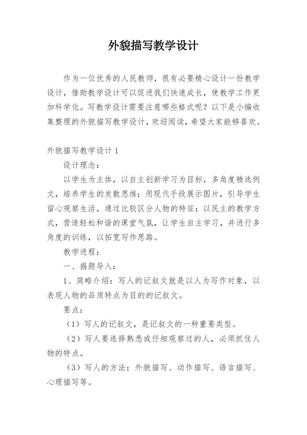 外貌描写教学设计作为一位优秀的人民教师,很有必要精心设计一份教学设计,借助教学设计可以促进我们快速成长,使教学工作更加科学化。写教学设计需要注意哪些格式呢?以下是小编收集整理的外貌描写教学设计,欢迎阅读,希望大家能够喜欢。外貌描写教学设计1设计理念:以学生为主体,以自主创新学习为目标,多角度精选例文,培养学生的发散思维;用现代手段展示图片,引导学生留心观察生活,通过比较区分人物的特征;以民主的教学方式,营造轻松和谐的课堂气氛,让学生自主学习,并进行多角度的训练,以拓宽写作思路。教学进程:一、揭题导入:1、