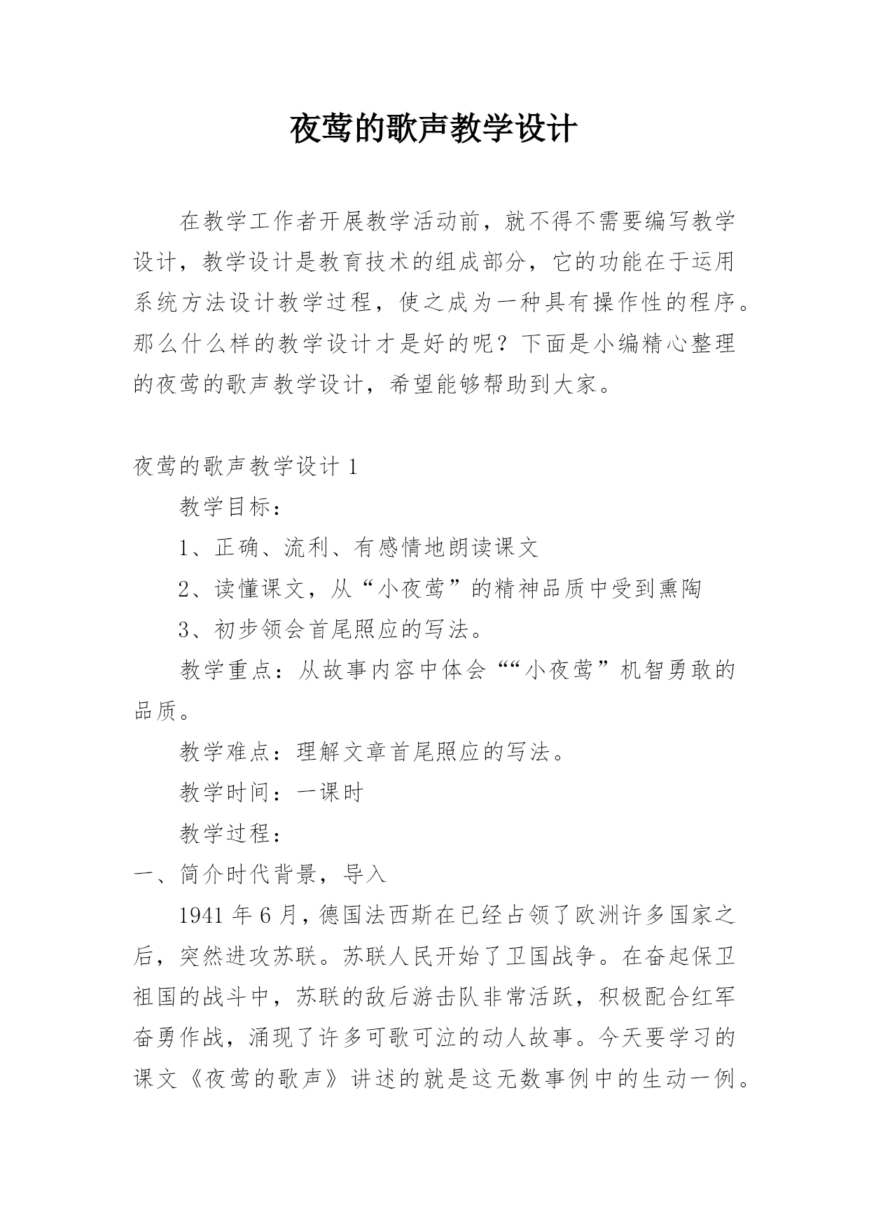 夜莺的歌声教学设计在教学工作者开展教学活动前,就不得不需要编写教学设计,教学设计是教育技术的组成部分,它的功能在于运用系统方法设计教学过程,使之成为一种具有操作性的程序。那么什么样的教学设计才是好的呢?下面是小编精心整理的夜莺的歌声教学设计,希望能够帮助到大家。夜莺的歌声教学设计1教学目标:1、正确、流利、有感情地朗读课文2、读懂课文,从“小夜莺”的精神品质中受到熏陶3、初步领会首尾照应的写法。教学重点:从故事内容中体会““小夜莺”机智勇敢的品质。教学难点:理解文章首尾照应的写法。教学时间:一课时教学过程