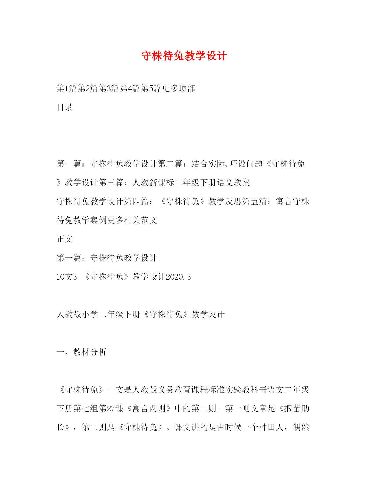 PAGE此资料由网络收集而来,如有侵权请告知上传者立即删除。资料共分享,我们负责传递知识。守株待兔教学设计第1篇第2篇第3篇第4篇第5篇更多顶部目录第一篇:守株待兔教学设计第二篇:结合实际,巧设问题《守株待兔》教学设计第三篇:人教新课标二年级下册语文教案守株待兔教学设计第四篇:《守株待兔》教学反思第五篇:寓言守株待兔教学案例更多相关范文正文第一篇:守株待兔教学设计10文3《守株待兔》教学设计2020.3人教版小学二年级下册《守株待兔》教学设计一、教材分析《守株待兔》一文是人教版义务教育课程标准实验教