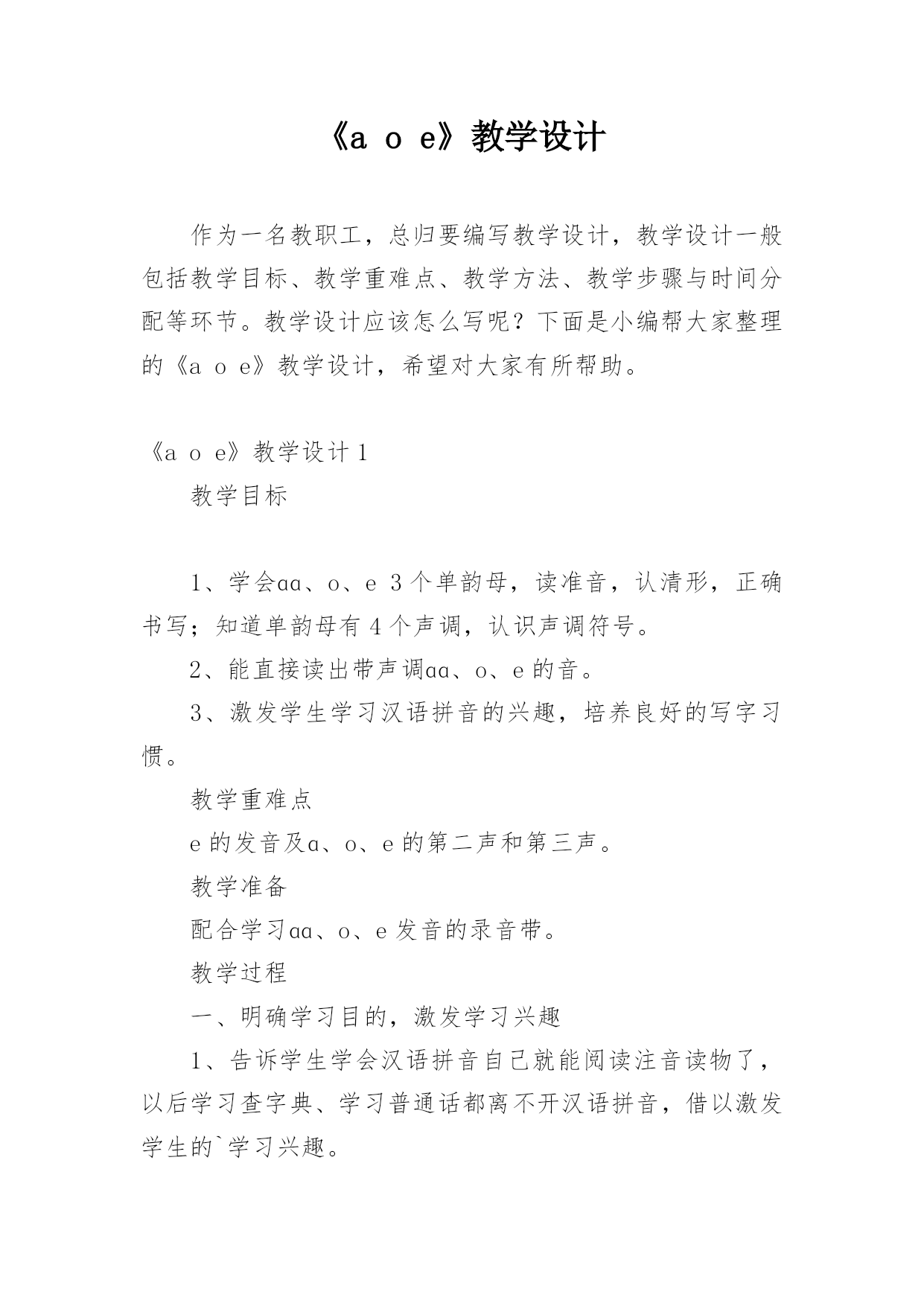 《aoe》教学设计作为一名教职工,总归要编写教学设计,教学设计一般包括教学目标、教学重难点、教学方法、教学步骤与时间分配等环节。教学设计应该怎么写呢?下面是小编帮大家整理的《aoe》教学设计,希望对大家有所帮助。《aoe》教学设计1教学目标1、学会ɑɑ、o、e3个单韵母,读准音,认清形,正确书写;知道单韵母有4个声调,认识声调符号。2、能直接读出带声调ɑɑ、o、e的音。3、激发学生学习汉语拼音的兴趣,培养良好的写字习惯。教学重难点e的发音及ɑ、o、e的第二声和第三声。教学准备配合学习ɑɑ、o、e发音的录音