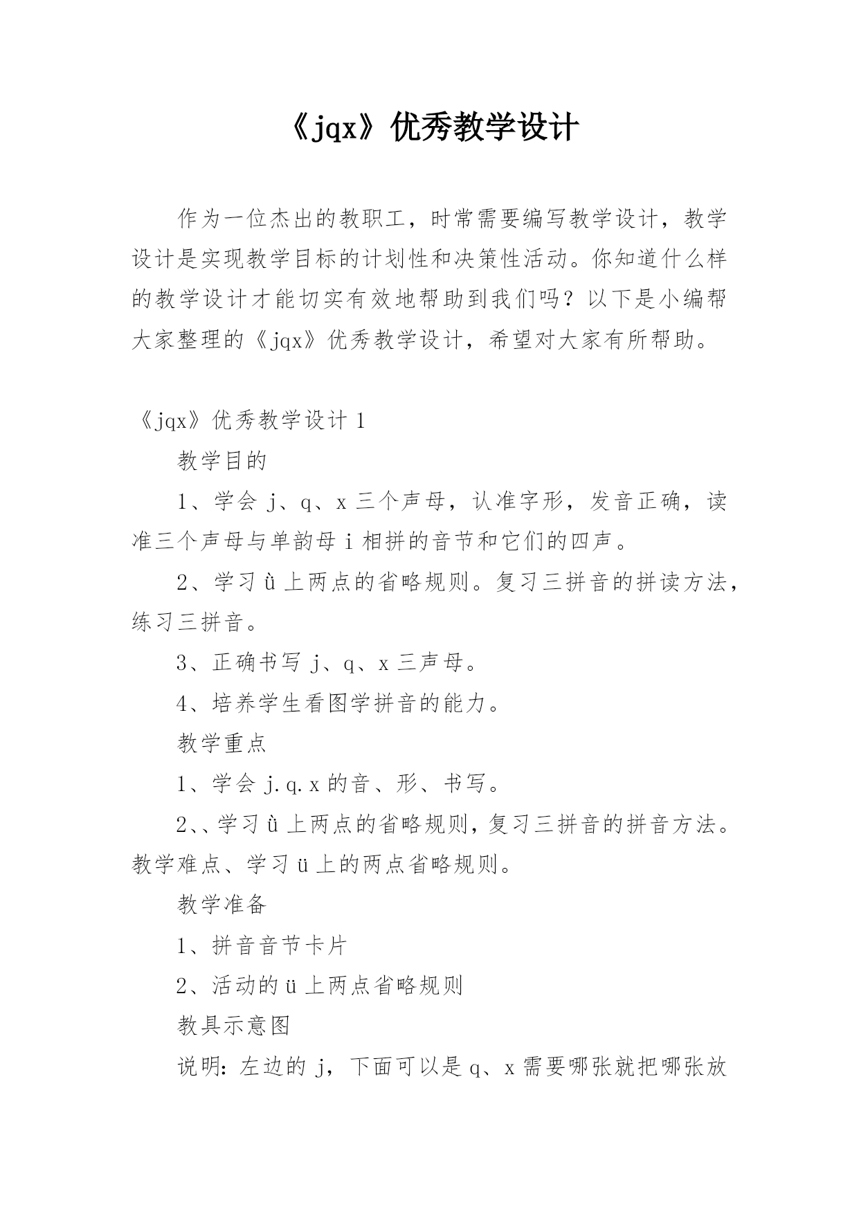 《jqx》优秀教学设计作为一位杰出的教职工,时常需要编写教学设计,教学设计是实现教学目标的计划性和决策性活动。你知道什么样的教学设计才能切实有效地帮助到我们吗?以下是小编帮大家整理的《jqx》优秀教学设计,希望对大家有所帮助。《jqx》优秀教学设计1教学目的1、学会j、q、x三个声母,认准字形,发音正确,读准三个声母与单韵母i相拼的音节和它们的四声。2、学习ǜ上两点的省略规则。复习三拼音的拼读方法,练习三拼音。3、正确书写j、q、x三声母。4、培养学生看图学拼音的能力。教学重点1、学会j.q.x的音、形、
