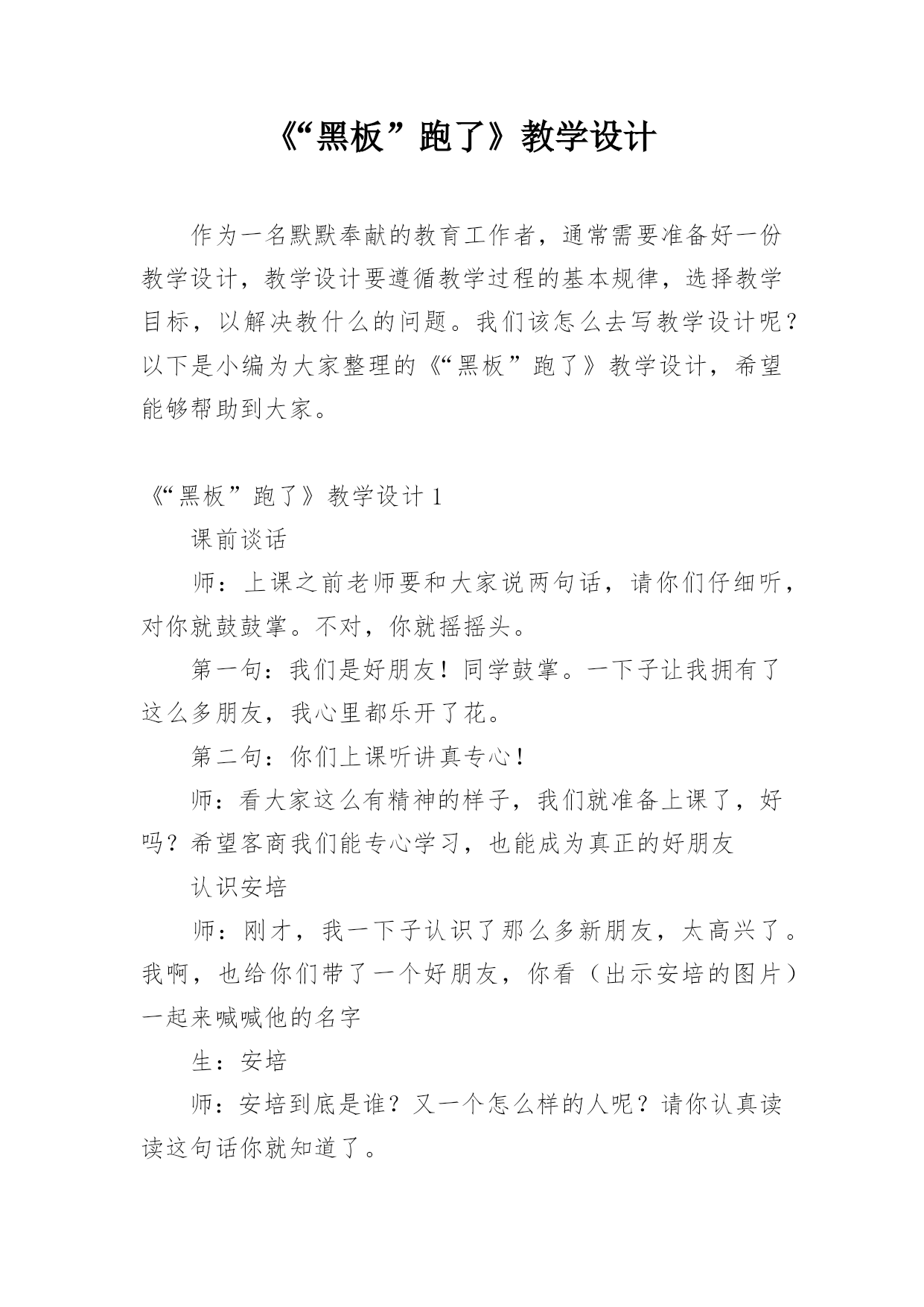《“黑板”跑了》教学设计作为一名默默奉献的教育工作者,通常需要准备好一份教学设计,教学设计要遵循教学过程的基本规律,选择教学目标,以解决教什么的问题。我们该怎么去写教学设计呢?以下是小编为大家整理的《“黑板”跑了》教学设计,希望能够帮助到大家。《“黑板”跑了》教学设计1课前谈话师:上课之前老师要和大家说两句话,请你们仔细听,对你就鼓鼓掌。不对,你就摇摇头。第一句:我们是好朋友!同学鼓掌。一下子让我拥有了这么多朋友,我心里都乐开了花。第二句:你们上课听讲真专心!师:看大家这么有精神的样子,我们就准备上课了,